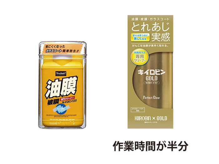 ガラスのギラギラ油膜を除去する「キイロビン」のハイグレードバージョン! 素早い「とれあじ」を本当に実感していただけるガラス専用クリーナーです。 がんこな油膜・被膜・ガラスコートを従来品の約2倍のスピードで除去できます。 その秘密はガラス系ナノパウダーと酸化セリウム。この2つの成分を融合させる事で、油膜・被膜に対してなじみが良くなり、「取れ始め〜終わり」までが格段に早くなりました。さらに、ガラス表面の目に見えない微細なキズを取り除く事で透明感が増し、使えば使うほどガラスが美しくなっていきます。