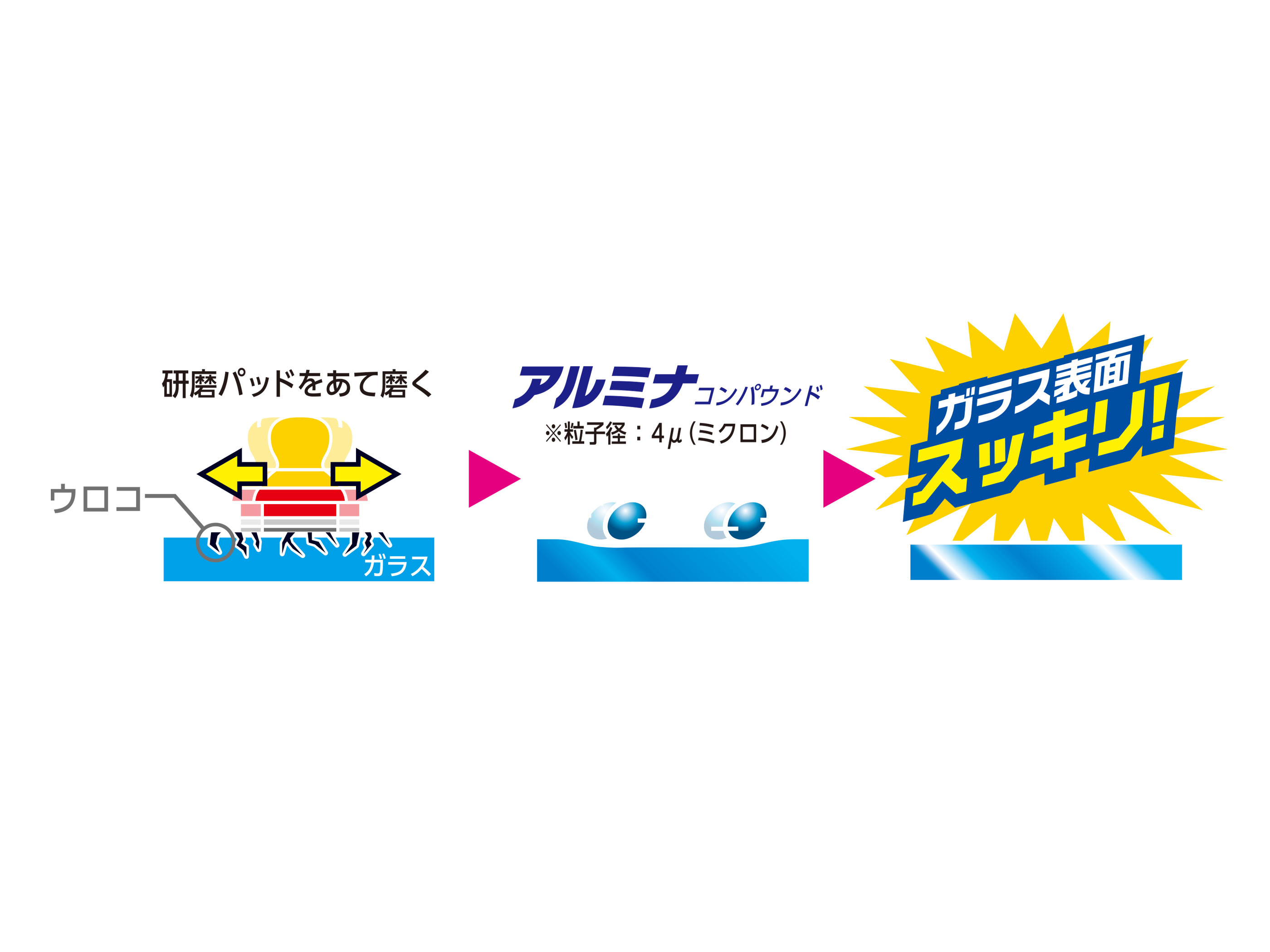油膜取りでは取れないウロコを“研磨”して除去する、ガラス用コンパウンドクリーナーです。 手を汚さずに使えるグリップボトルと、最適な圧力で磨ける二層研磨パッドにより、作業時の力を逃がさずスピーディーに作業できます。さらに、ガラス磨きに最適な、アルミナコンパウンドがウロコの凹凸を平滑にし、透き通るクリアなガラスに仕上げます。フロントガラスはもちろんリア・サイドなど、ガラス全面に使用できます。 <姉妹品紹介> 薬剤を塗って“溶かして落とす”サイドガラス用のウロコ取り「A-61魁 磨き塾 ウロコ取りクリーナー」もおすすめです。