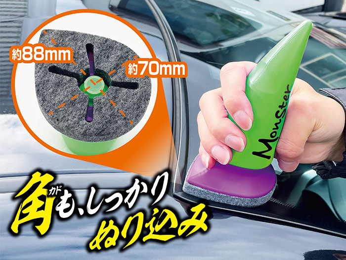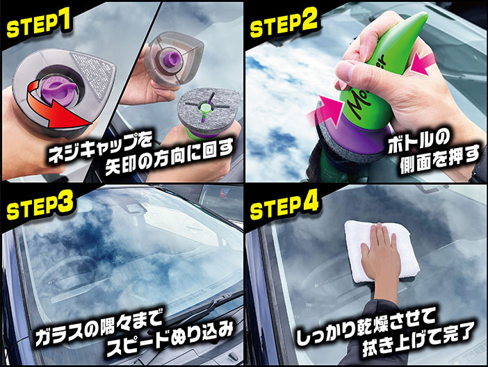 雨の日の視界を良好にする窓ガラス専用塗り込みタイプの撥水コーティング剤です。手を汚さず塗り込んで拭き取るだけで手軽に施工が完了します。シリコーンとフッ素化合物を組み合わせたハイブリッド処方により約4ヶ月持続する超撥水を実現。突然の豪雨や台風時の大雨、さらに対向車の水はねなどの際も優れた撥水力で安全な視界を確保します。フェルトにもこだわり、ビッグなティアドロップ(雫)形状でガラスの広い面を一気に塗り込めます。また三角の部分で隅々まで塗り込め、ガラス全体を満遍なくスピーディーに施工ができます。