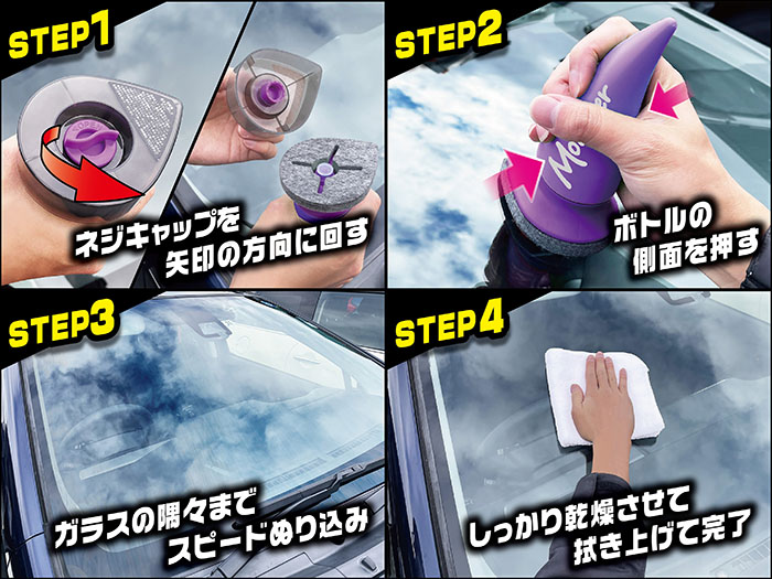 雨の日の視界を良好にする窓ガラス専用塗り込みタイプの撥水コーティング剤です。手を汚さず塗り込んで拭き取るだけで手軽に施工が完了します。高純度のフッ素変性シリコーンで撥水効果が約12ヶ月の超耐久を実現。有効成分がガラス表面を覆い定着することで強固な撥水被膜を形成し、摩擦に強く耐久性に優れた仕上がりになります。雨はもちろん豪雨や台風時の大雨、さらに対向車の水はねなどの際も安全な視界を確保します。フェルトにもこだわり、ビッグなティアドロップ(雫)形状でガラスの広い面を一気に塗り込めます。また三角の部分で隅々まで塗り込め、ガラス全体を満遍なくスピーディーに施工ができます。