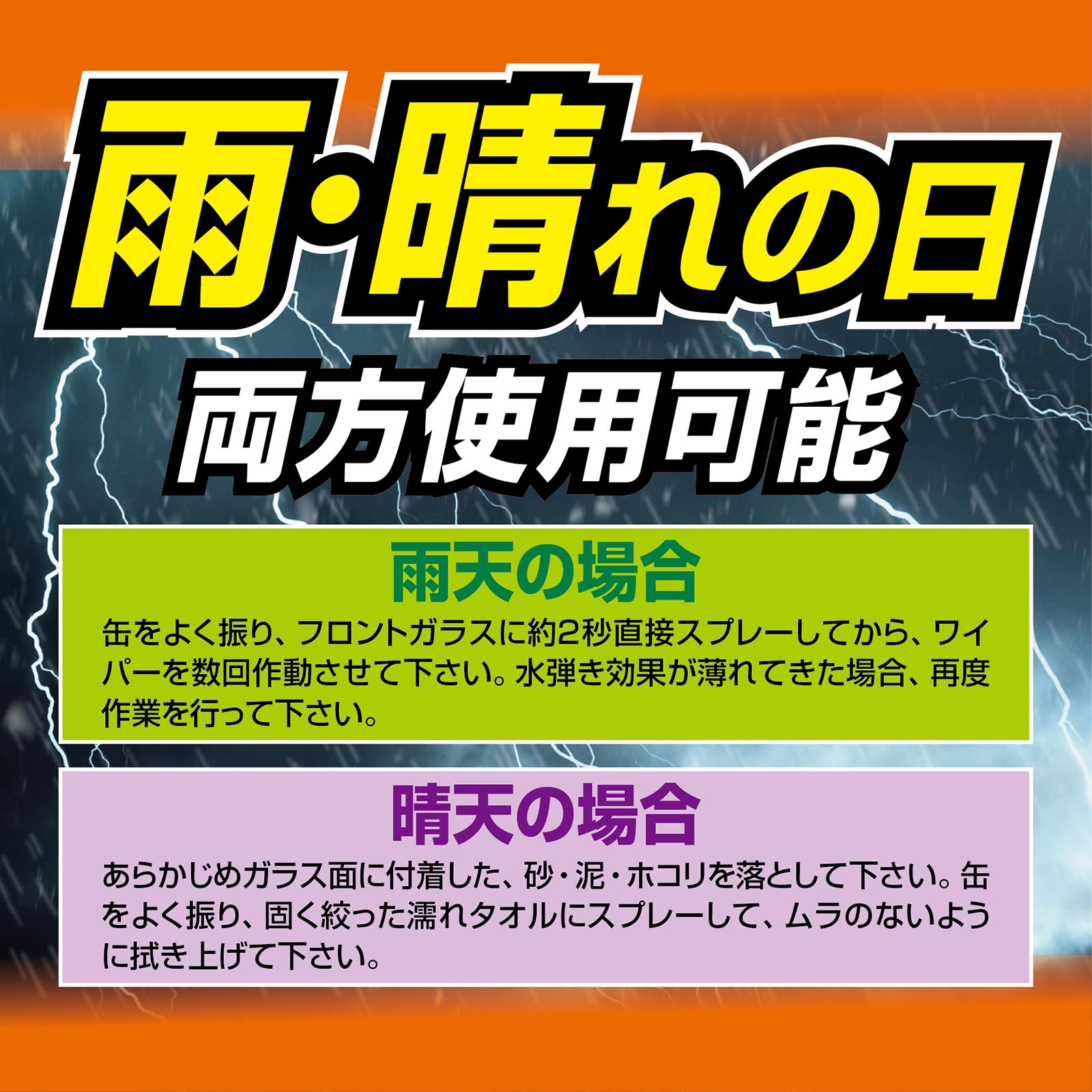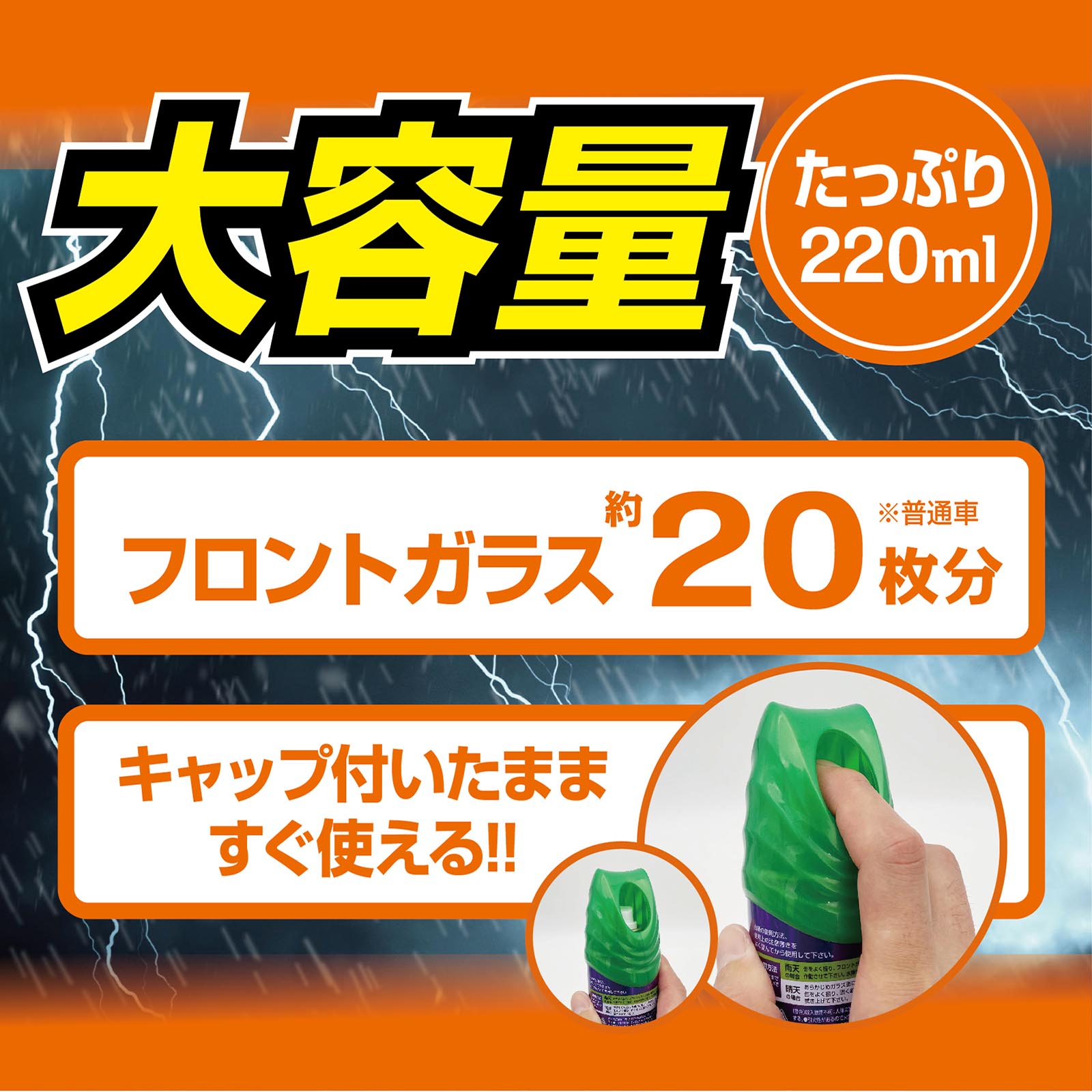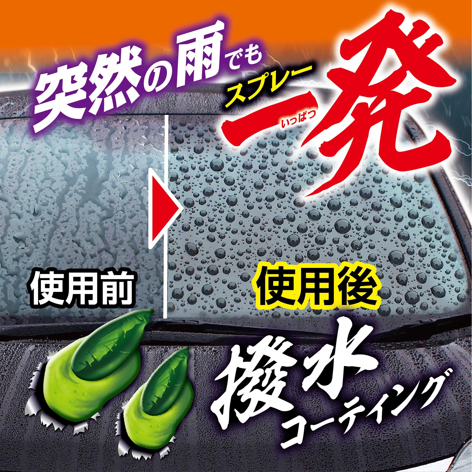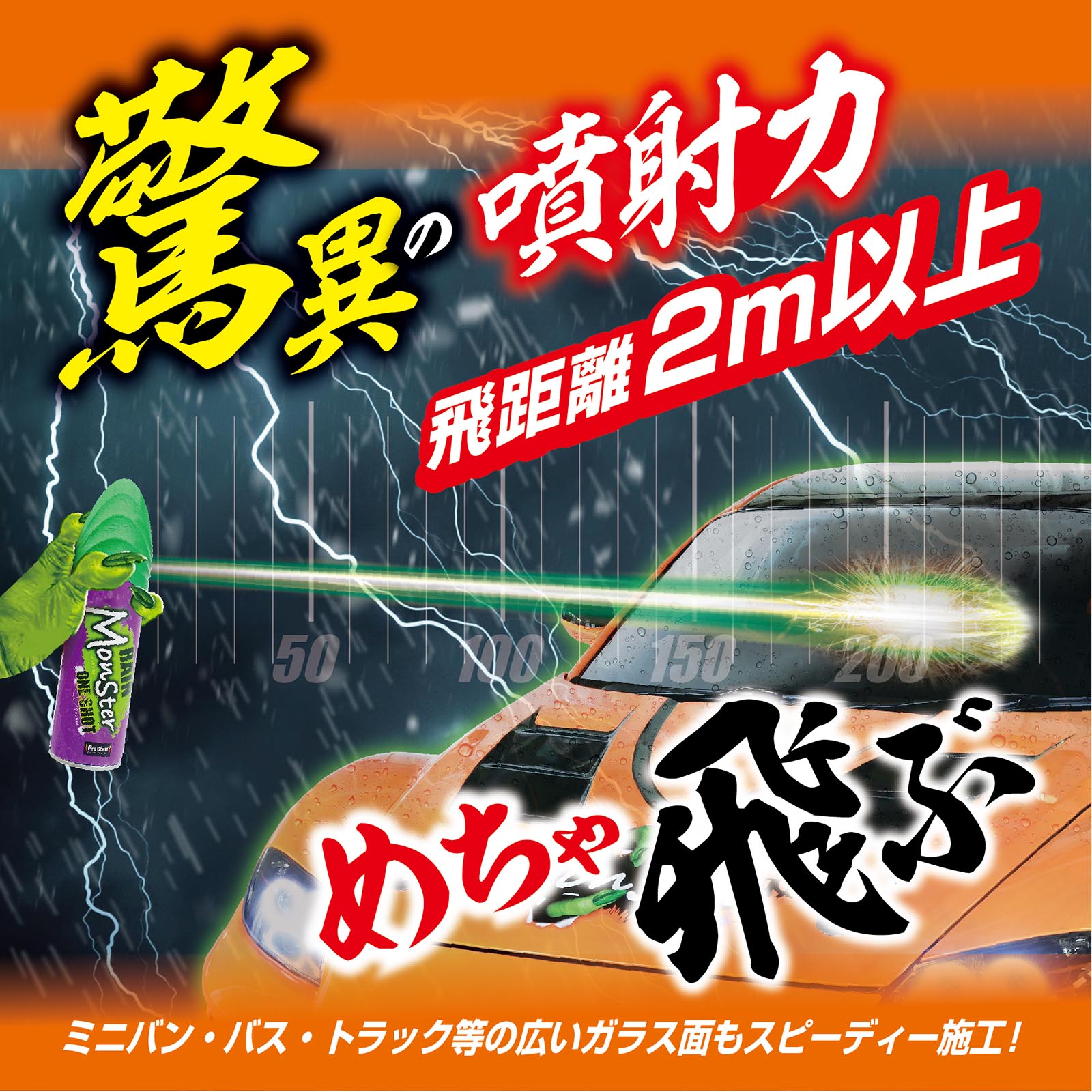 突然の雨でも、一発約2秒噴射してワイパーするだけで雨粒を弾く窓ガラス用撥水スプレーです。 瞬着撥水成分配合により雨の中でも窓ガラスに定着し、水弾きが悪く見えにくい視界を解消します。驚異の噴射力! 飛距離2m以上で、豪雨時でも窓ガラスに届き瞬時に撥水。またミニバンやトラック等の広いガラスでも、驚く程簡単に施工できスピーディーに仕上がります。さらに、重ね塗りできるので視界不良時に手軽に使用できます。 視界を切り開くような優れた撥水効果で、雨の日の運転が見やすく快適になります。
