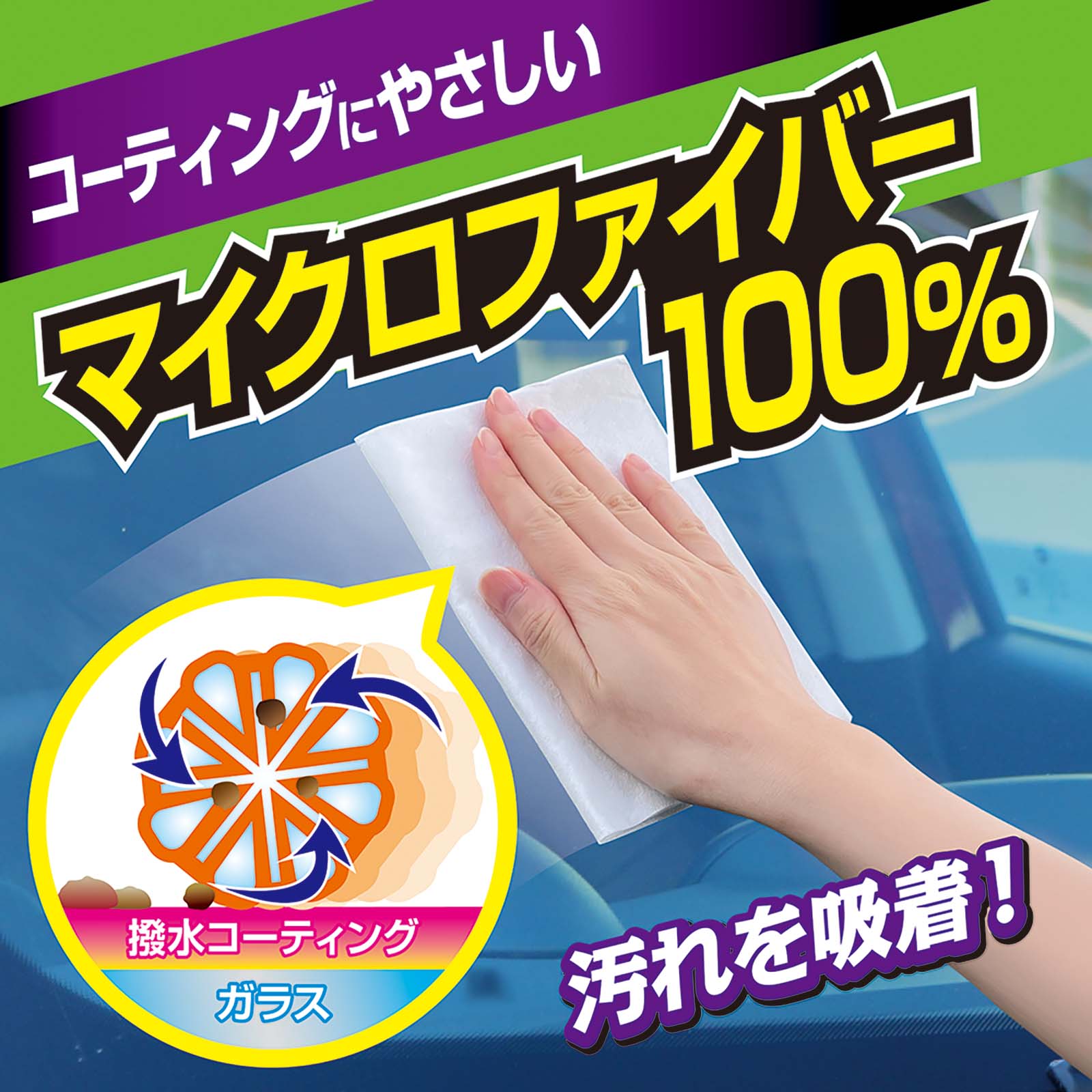 サッと拭くだけで汚れを落とし、撥水効果を与える外窓ガラス専用ウェットクロスです。 コーティング被膜にやさしいマイクロファイバー100%クロスを採用。 超極細繊維が汚れを内部に吸着して虫・鳥フンや花粉・雨降り後の汚れ等をスッキリ落とし、拭きスジが残りにくくキレイに仕上がります。 さらに撥水成分配合によりガラス表面に撥水被膜を形成!使用中の撥水ガラスコートの性能を補強し、効果を長持ちさせます。 ガラス撥水剤・レインモンスターシリーズ使用後のメンテナンスに最適です。