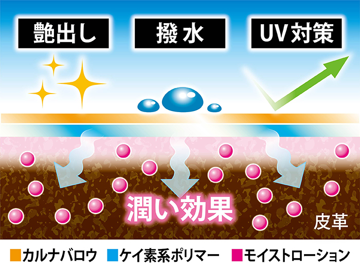 革(シート・ハンドル等)に、艶と潤い・保護効果を与える本革・合皮用メンテナンス剤です。繰り返し着座(摩擦・ヨレ・引っぱり)することで、革内部の油分が無くなり柔軟性が減り、硬化してヒビ割れを起こします。さらに熱・紫外線等で、革が乾燥して潤い・艶が無くなり色あせにもなります。本品は劣化を防止し、しなやかなでハリのある革の状態を維持します。2種類の艶出し成分配合により、油分の減少や乾燥を防いで深く濃い艶を与えます。さらにUV吸収剤配合で色あせも防ぎます。またケイ素系ポリマー 配合により水分を弾き雨等の革のシミ跡も防止し、淡色系シートへの衣類の色移りも軽減します。黒ズミ・手アカ汚れもスッキリ落とし、あざやかさを甦らせ、しっとり上質な革をより長く維持します。