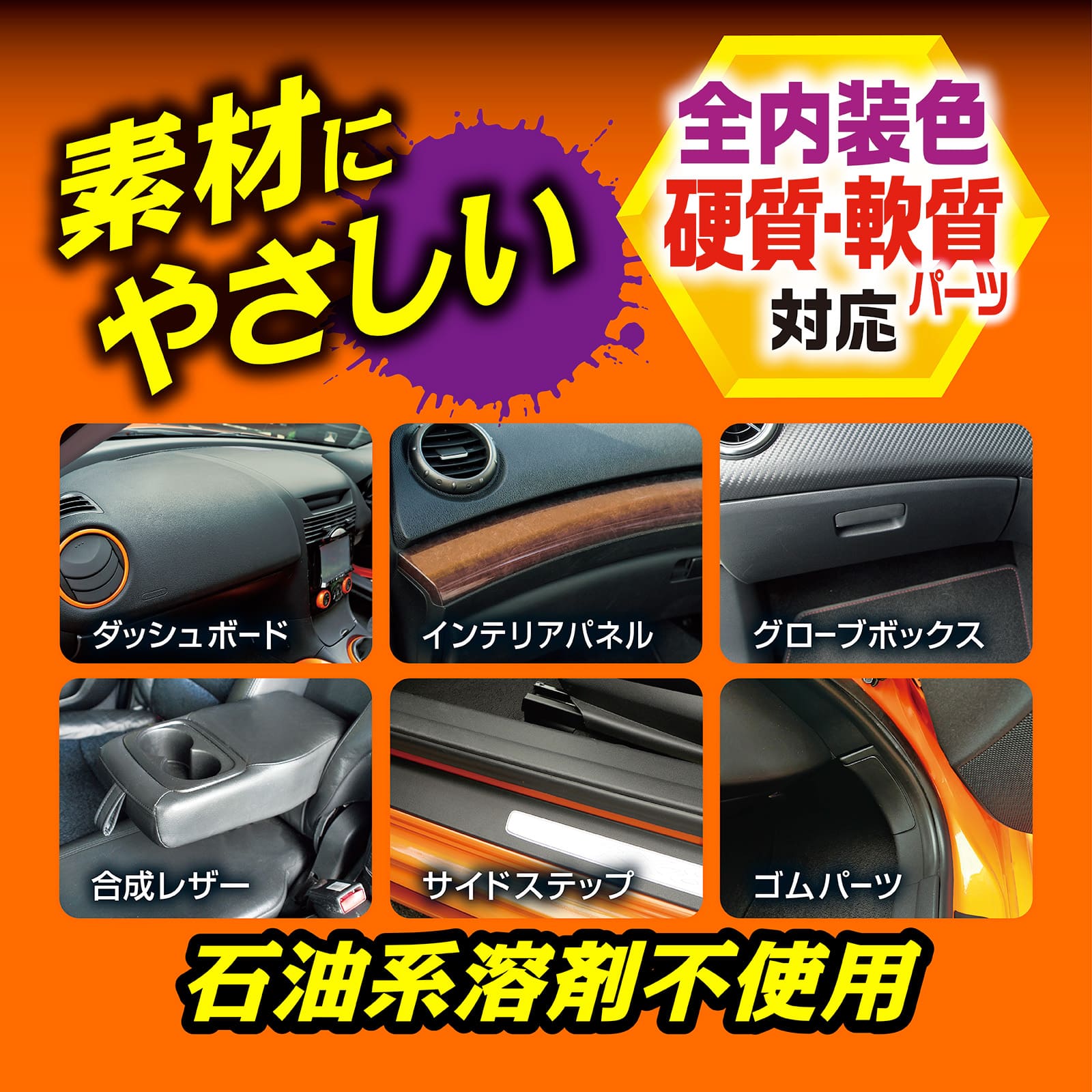 内装のドアパネル・ダッシュボードなど、硬質・軟質パーツに上質な艶を与えて長期間保護する内装用コーティング剤です。 新車時のような素材本来の色・質感・艶を与える2種類の艶出し成分を配合し、ムラになりにくく、ギラつかないサラッとした仕上がりになります。 また、紫外線による色褪せや劣化を防ぐUV吸収剤に加え、ホコリや手アカ汚れが付きにくい耐久コーティング効果により、キレイな状態を維持します。 さらに、石油系溶剤不使用で素材に優しい中性タイプ。全内装色、ステッチのあるソフトパッドなどの軟質パーツにも安心して使用できます。