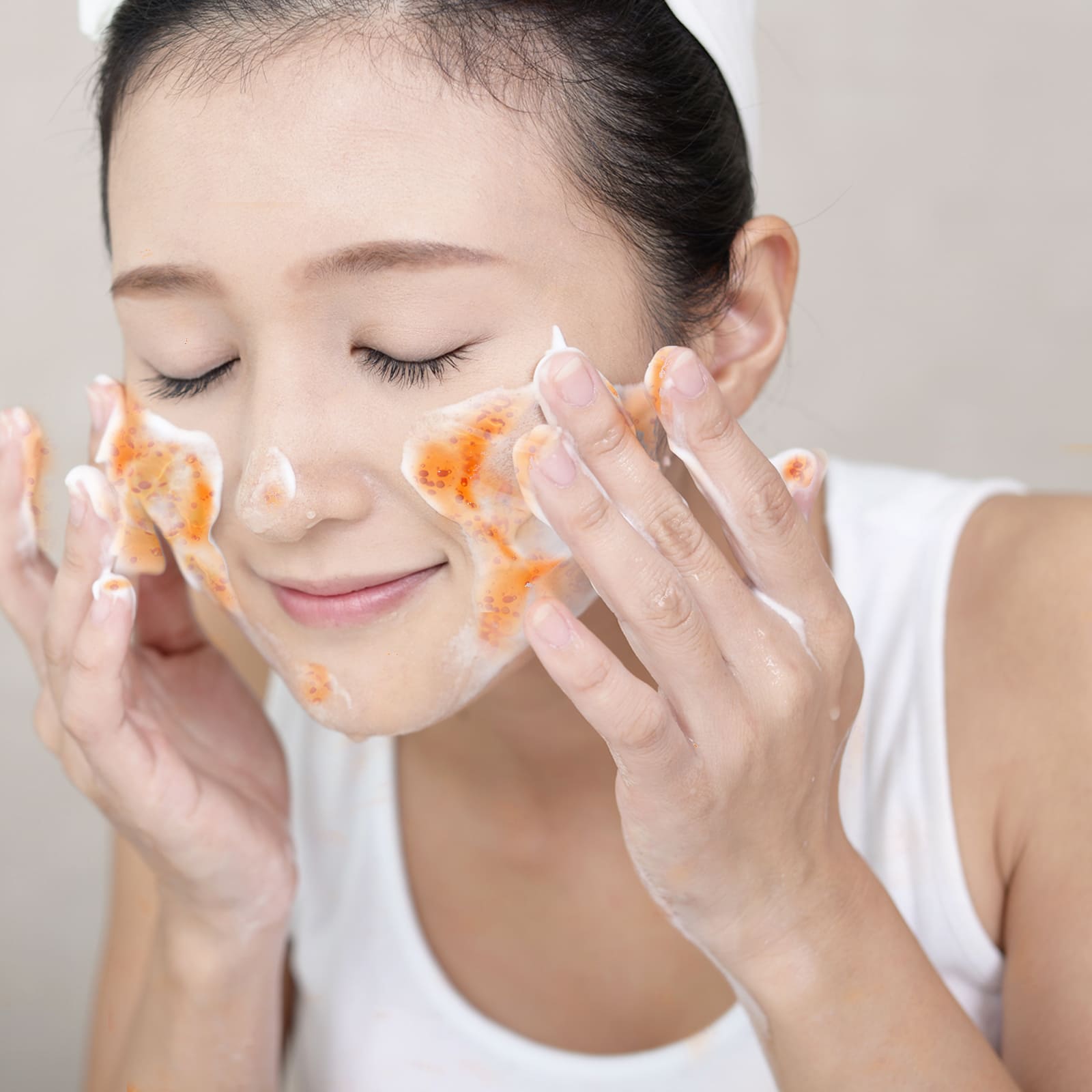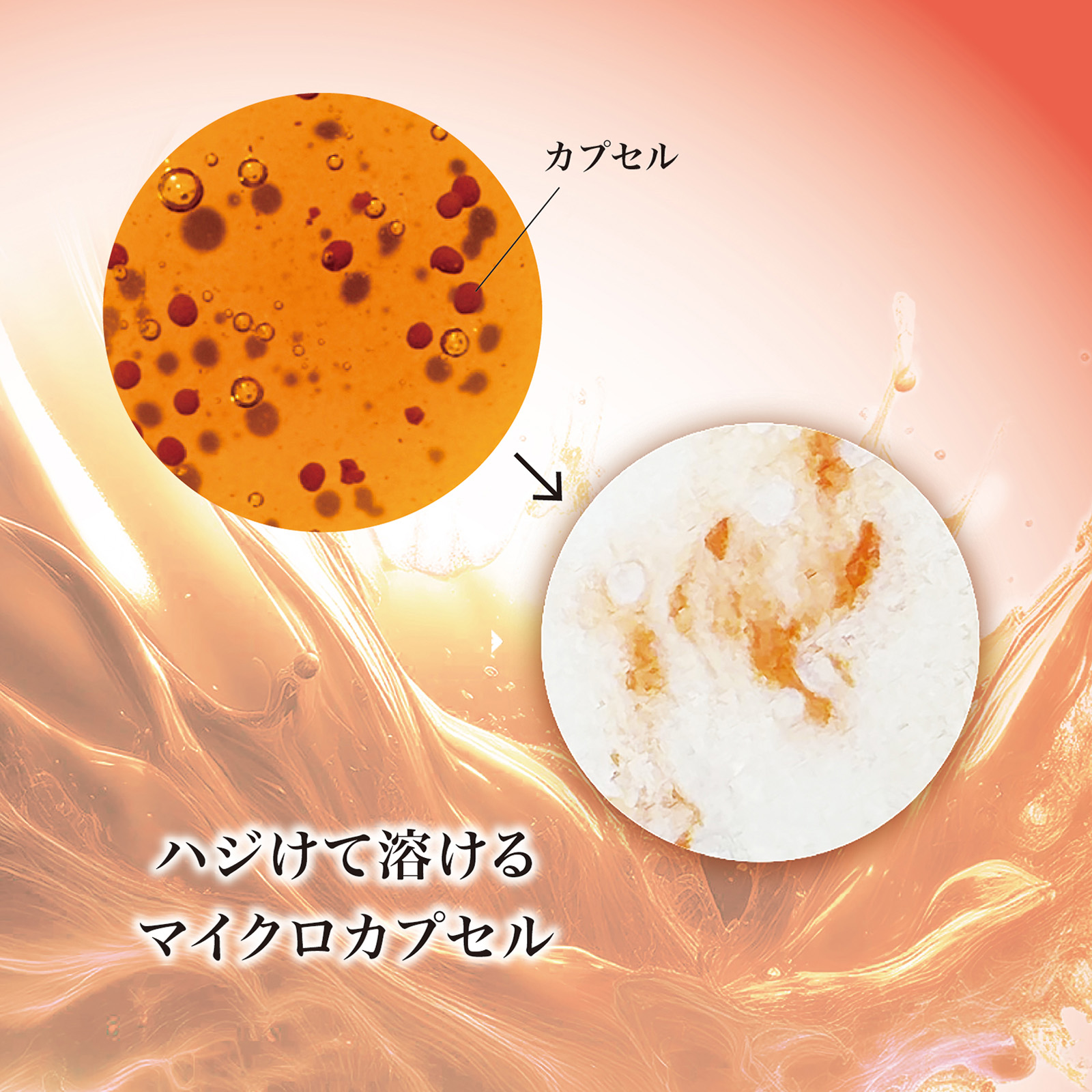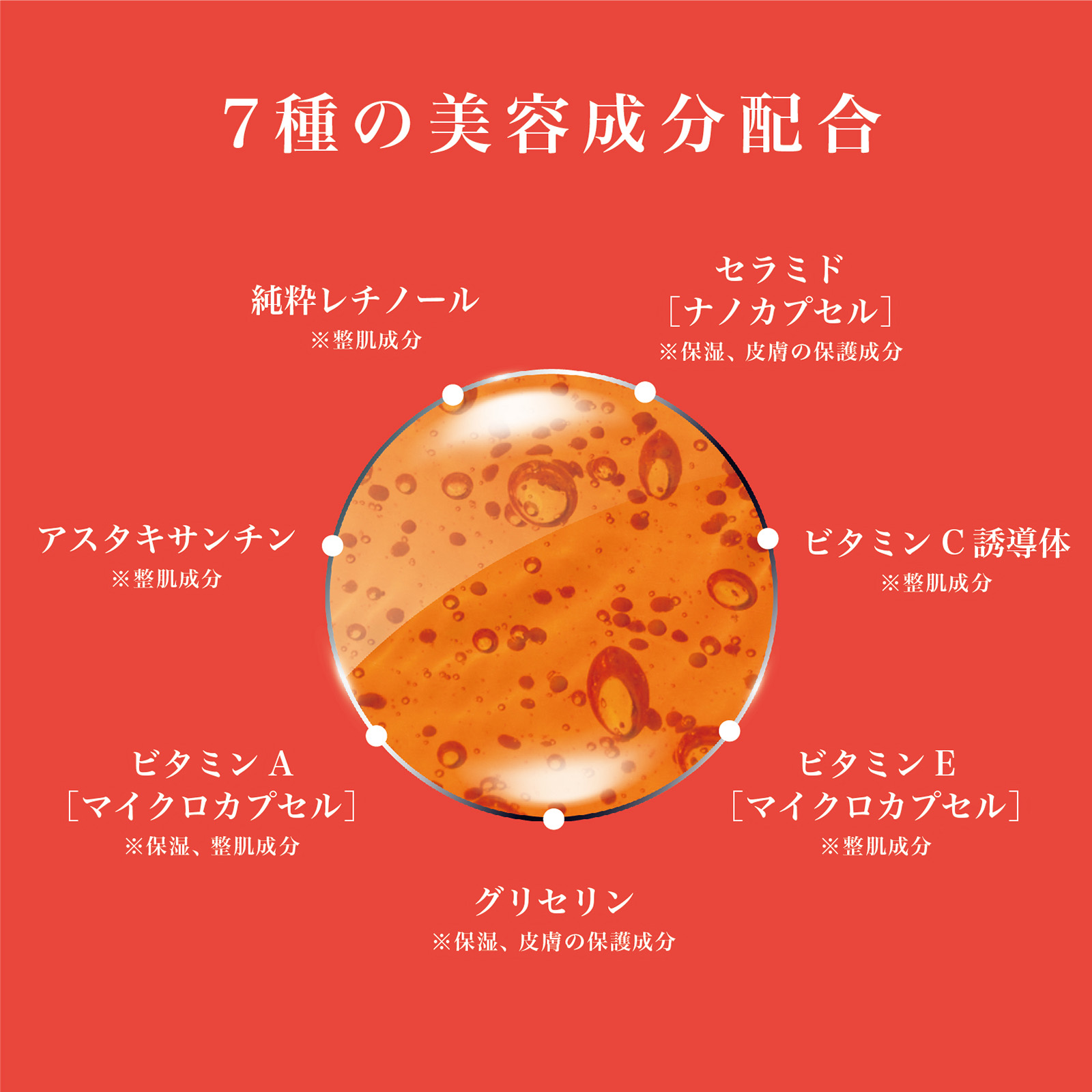 洗顔と同時に保湿やエイジングケア*2ができる新発想の「オールインワン洗顔」です。独自設計のジェルが肌に隅々までいきわたり、洗い上がりと同時に肌にうるおいとハリを与えます。 2つのカプセル技術で酸化することなく肌に届き洗い流した後も保湿成分が肌にとどまり、しっとりした洗い上がりに導きます。 *1アスタキサンチン(整肌成分)、純粋レチノール(整肌成分)、セラミド(保湿、皮膚の保護成分) 、ビタミンA(保湿、整肌成分)、ビタミンE(整肌成分)、グリセリン(保湿、皮膚の保護成分)、ビタミンC誘導体(整肌成分) *2年齢に応じたケア