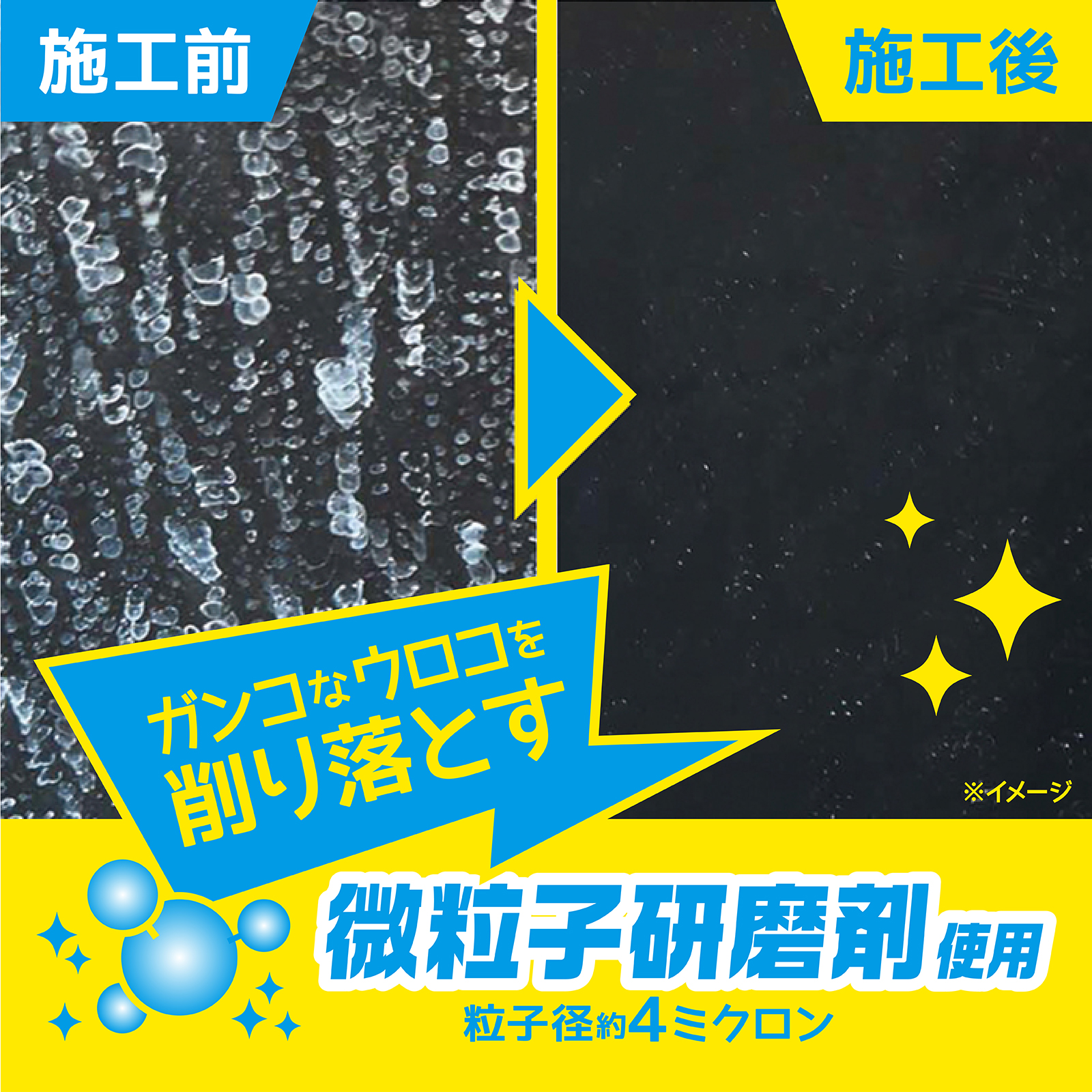 浴室鏡などのなかなか取れないガンコな水アカ・ウロコを除去する鏡専用クリーナーです。 鏡に最適な微粒子研磨剤を配合し、しつこい水アカ・ウロコの凹凸をスッキリ磨き落として平滑にします。 また、磨きやすい設計のグリップボトルと、最適な圧力で磨ける2層式研磨パッドを組み合わせることで、手を汚さずスピーディーに作業でき、クリアな鏡に仕上げます。 シンプルなボトルデザインで浴室においても生活感を感じさせず、汚れが気になった時に手軽にご使用いただけます。