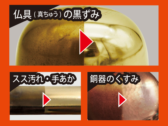 真ちゅう製の仏具や銅器類の輝きを復活させる専用クリーナーです。 素材に優しく、くすみをしっかり落とす極細コンパウンドを配合し、磨くだけで真ちゅう製品(おりん、火立、香炉など)の黒ずみ・手あか・ロウソク・線香のスス汚れや、銅製品(鍋、やかん、タンブラーなど)のくすみ・汚れを取り除きます。 法事の前や大掃除、仏具メンテナンスの際などに最適です。 専用マイクロファイバークロスを付属し、気になった時に手軽にお使いいただけます。
