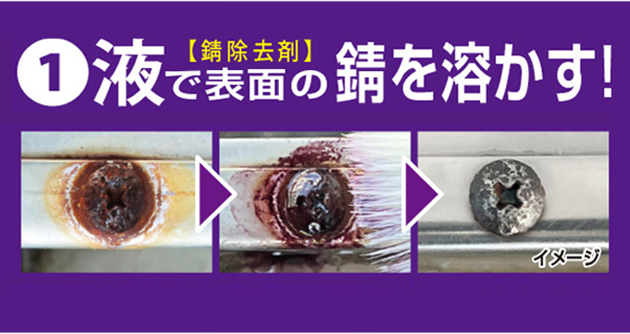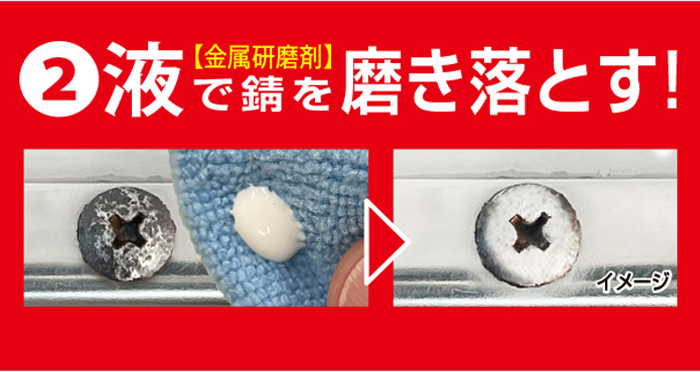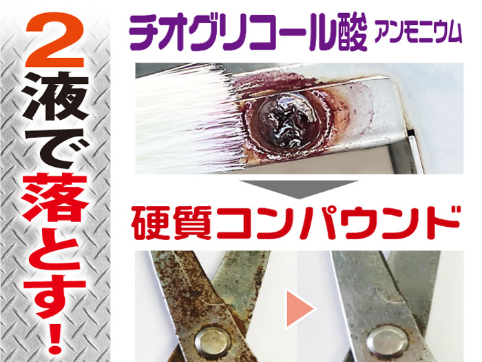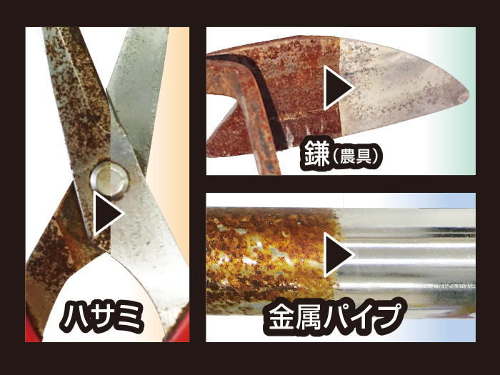 農具等の刃物や、ネジ、ボルト、車体などに付着したガンコな金属錆を溶かして磨き落とす専用クリーナーキットです。 放置してできた赤錆や使い古した道具の錆に最適!【1液:錆除去剤】で金属表面の赤錆を化学反応で溶かし、【2液:金属研磨剤】で残った錆をしっかりと磨き落とします。 素地の金属(鎌、ハサミ、ノコギリなど)、鋼、アルミのサビや、ネジ、ボルト、車体、農具、スキー板などの部分的な箇所まで幅広い錆に対応します。 また、手では磨けないネジのキワや金属接合部の隙間、プラスチック部に付着したもらい錆は【1液:錆除去剤】だけで落とす事もできます。 専用のハケとクロスを付属し、気になった時に手軽にお使いいただけます。