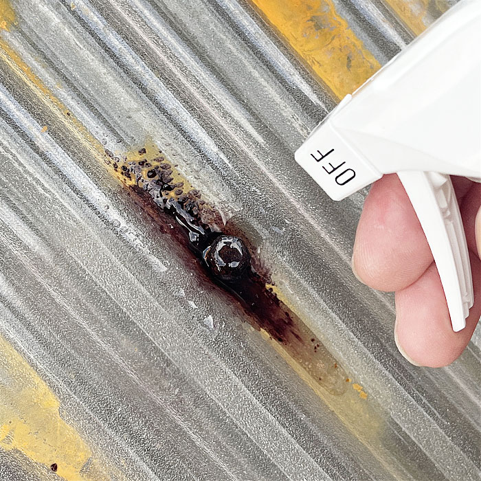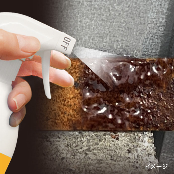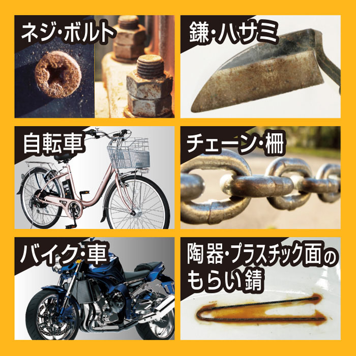 金属表面にできた赤錆をスプレーするだけで溶かし落とす専用クリーナーです。 鎌・ハサミ・ノコギリなどの刃物や、バイク・車・自転車・チェーンなど幅広い箇所の錆に対応します。 ジェル状の液「チオグリコール酸アンモニウム※」が施工面にしっかりと密着し、濃紫色に変化する化学反応により錆を溶かし落とします。また、傾斜部でも液ダレしにくく、臭いが拡散しにくい低臭タイプで快適に使えます。 さらに、陶器・プラスチックに付着したもらい錆や、落としにくいネジのキワや接合部の隙間の錆にも最適です。気になった錆にスプレーするだけで手軽にご使用できます。