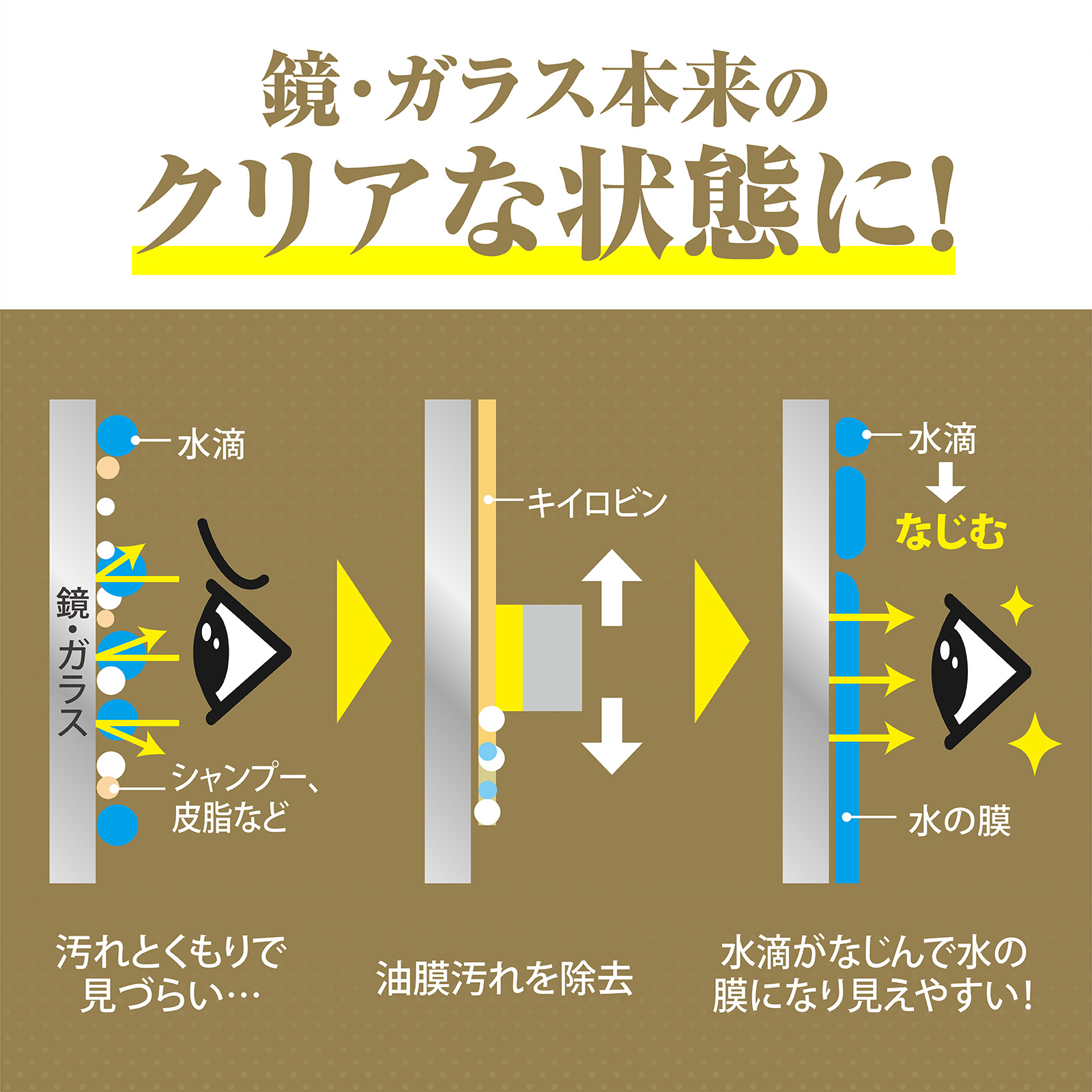 車のプロコーティング・洗車専門店や銭湯の鏡のメンテナンスにも使われるガラスの油膜除去剤「キイロビン」から、ご家庭でも手軽に使えるプロ品質の浴室鏡・ガラス用クリーナーが登場。 くもりの原因となるシャンプーや石ケンの固着汚れ・皮脂などのこびりついた油分汚れを、ガラス系ナノパウダー(超微粒子研磨剤)で素早く除去します。 汚れを落としながら微細なキズを消して滑らかにすることができ、定期的に使用することでクリアで汚れにくい状態を維持します。 鏡・ガラスだけでなく、洗面台・トイレ等の陶器の汚れ落としにも最適です。