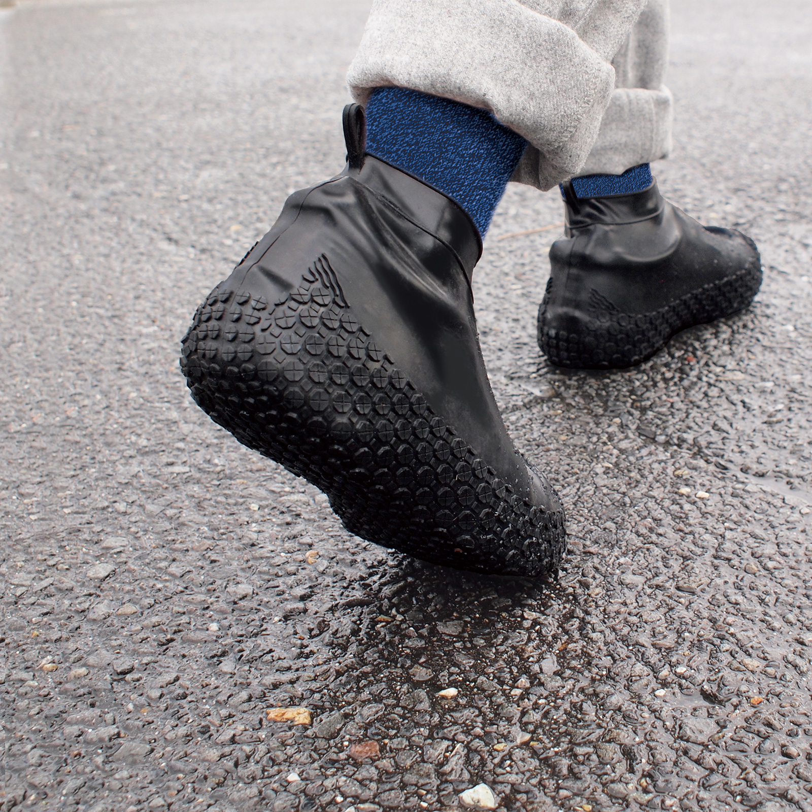 雨の日に、靴の上からそのまま履けるシリコンタイプ携帯用長靴です。 シリコンゴム100%で継目がないため、水が侵入しません。伸縮性が良く靴にピタッと密着し、雨水や汚れから大切な靴を守ります。 ソール部の凹凸と溝により、靴底に付いた水をスムーズに除水することで路面に密着するため、歩行がしやすくなっています。 靴のシルエットが変わらず、服装に違和感を与えにくいため、普段使いに最適。洗車やガーデニング、自転車・バイクの乗車時、会社や学校等の通勤時、急な豪雨等、様々なシーンで活躍します。