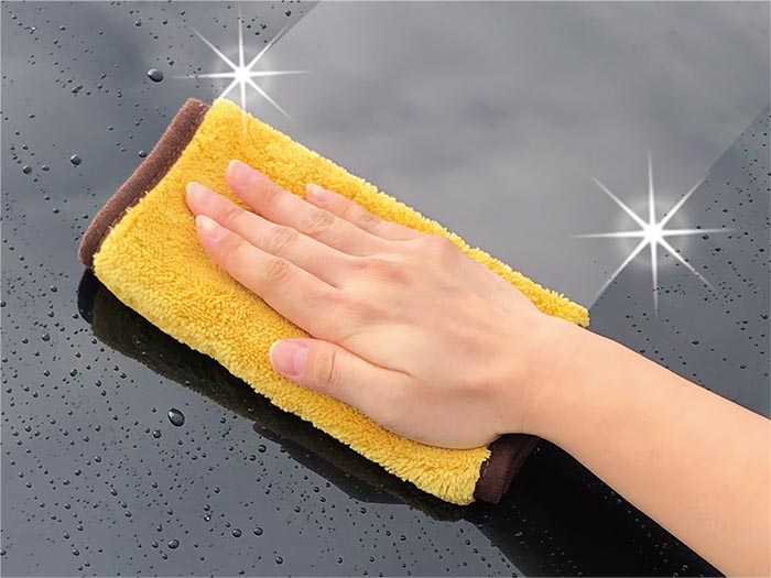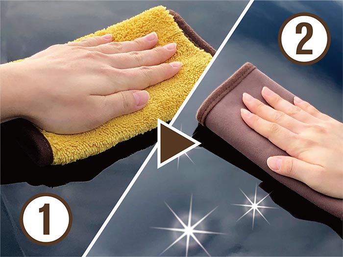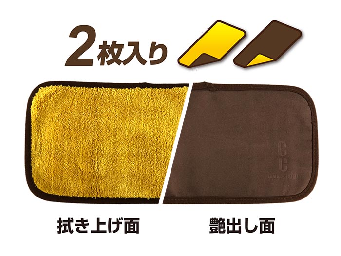CCウォーターゴールドがより艶ツヤにスピーディーに仕上がる、2WAYマイクロファイバークロスが使いやすいコンパクトサイズになりました。 ボディーが濡れた状態・乾いた状態の両方で使用できる毛足の長い拭き上げ面と、艶出し・仕上げに最適な艶出し面の両面2WAYタイプです。吸水性の優れた毛足7mmの拭き上げ面は、クロスがよれにくくスムーズに作業でき、ボディーが濡れた状態でもスピーディーに仕上がります。 艶出し面は、メガネ拭きで使用しているきめ細かい超極細繊維仕様。目に見えない程の拭き残しを平滑にし、シャープな輝く艶に仕上げます。2枚入りで使い分けできるようになったため、こだわる方や、より手軽に仕上げたい方に最適なクロスです。