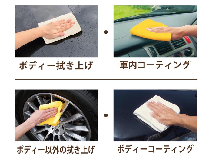 スプレーして拭くだけで簡単コーティングができる“CCウォーター”シリーズ施工用のマイクロファイバークロスです。 2色入でボディー・車内・ホイール・ガラスなど使用箇所によって使い分けができます。また、両面の毛足の長さが異なり、濡れたままのコーティングには「毛足の長いソフト面」、乾いた状態からのコーティングには「毛足の短いパイル面」と、ボディーの状態によって両面の使い分けが可能。CCウォーターの効果を最大限に引き出します。 その他、コーティング作業以外にも車の様々なお手入れでお使いいただける超便利なクロスです。