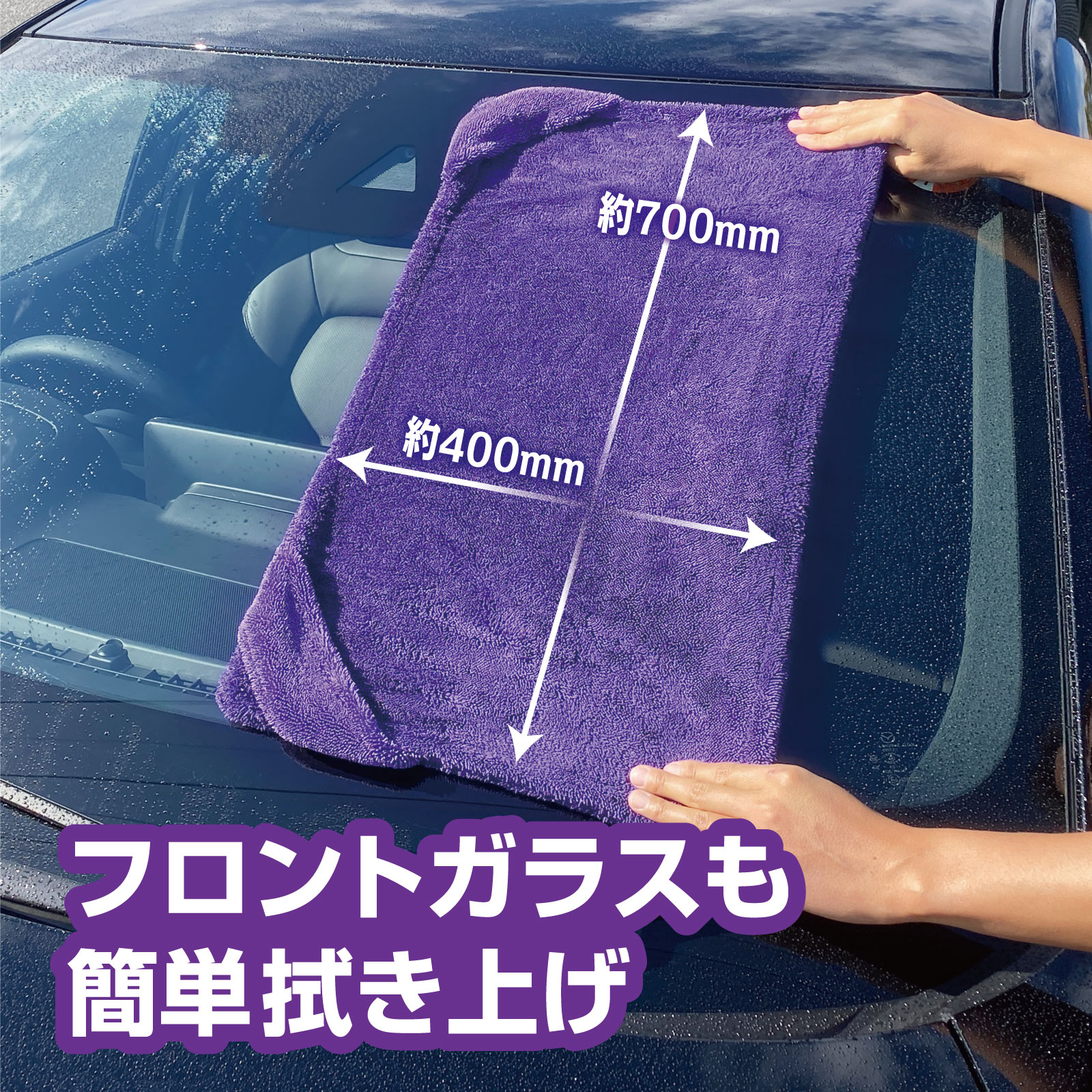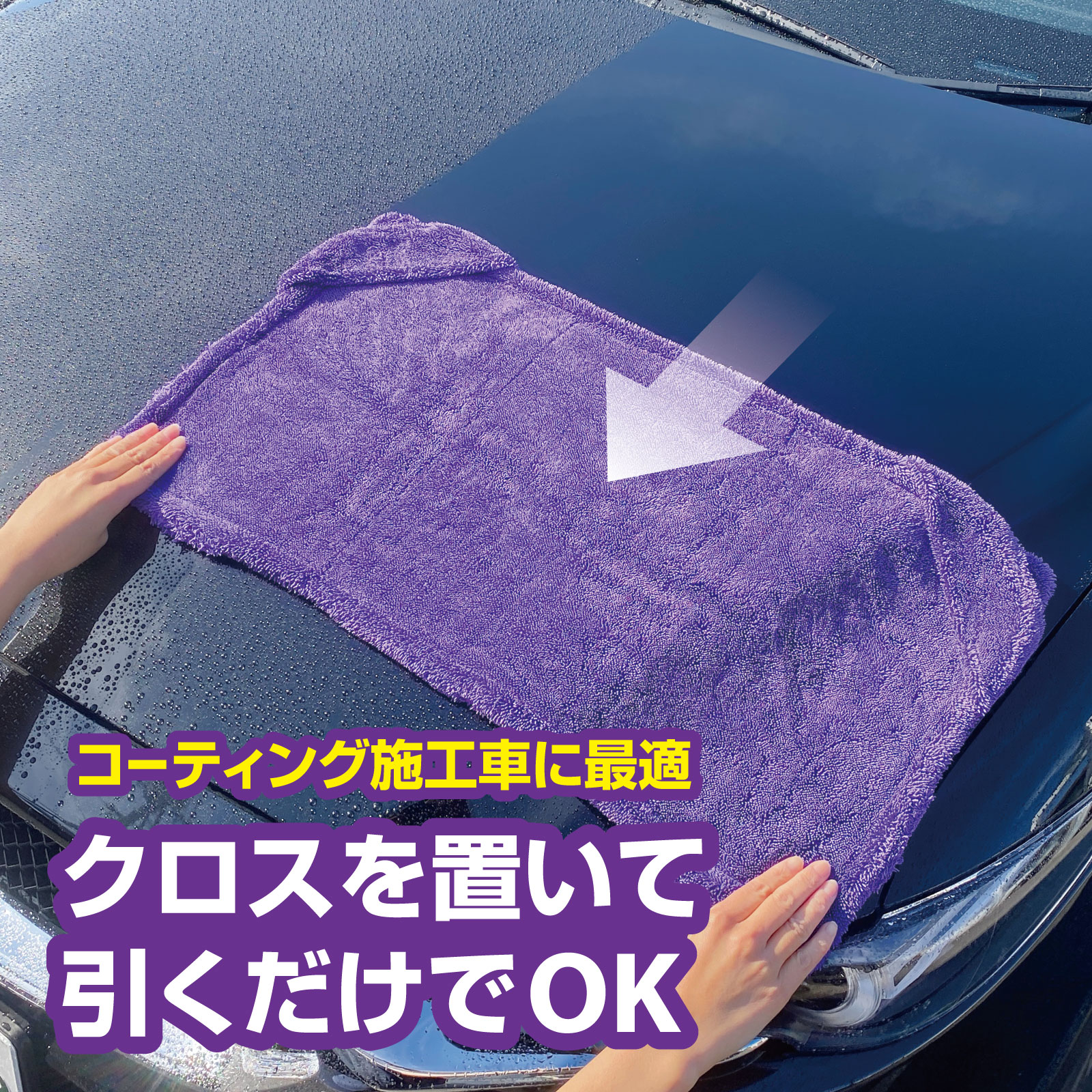 極厚両面ツイストマイクロファイバー仕様の、洗車後の水滴拭き上げに最適な吸水用クロスです。 ボンネットやルーフ、フロントガラスにクロスを置いて引くだけでOK。ボリュームたっぷりの超極細繊維により、水滴を残さず拭き上げます(約1.4L)。 また繊維をツイスト状にすることで、拭き上げ時の抵抗が減少。コーティング被膜に摩擦ストレスを極力与えない、やさしいクロスです。拭きにくい側面は、サポートバンド(2箇所)を握って作業すればクロスを軽く当てるだけで一気に拭き上げできます。両面生地でクロスのフチまでしっかり吸水するので、狭いバイザーもサッと拭き取れます。何度も拭かなくても ボディーからガラスまでこれ1枚で驚くほどスピーディーに仕上がります。