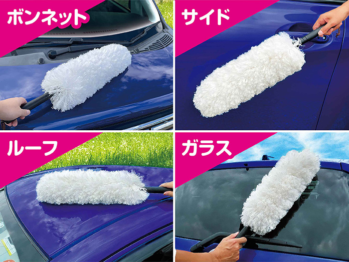 ふわふわの繊維で360度吸着する自動車外装用ホコリ取りモップです。 異なる素材のダブル繊維により、ホコリ・黄砂・花粉を余すことなくスピーディーに除去。静電気が起こる「静電気吸着素材」がホコリを引き寄せ、ボディーにやさしい素材の「マイクロファイバー」が引き寄せられたホコリをしっかり絡め取ります。さらに、手の届きにくいルーフもラクに作業ができるロングサイズで、車まるごと使用できます。短時間でキレイに作業でき、日頃のお手入れに最適なホコリ取りモップです。