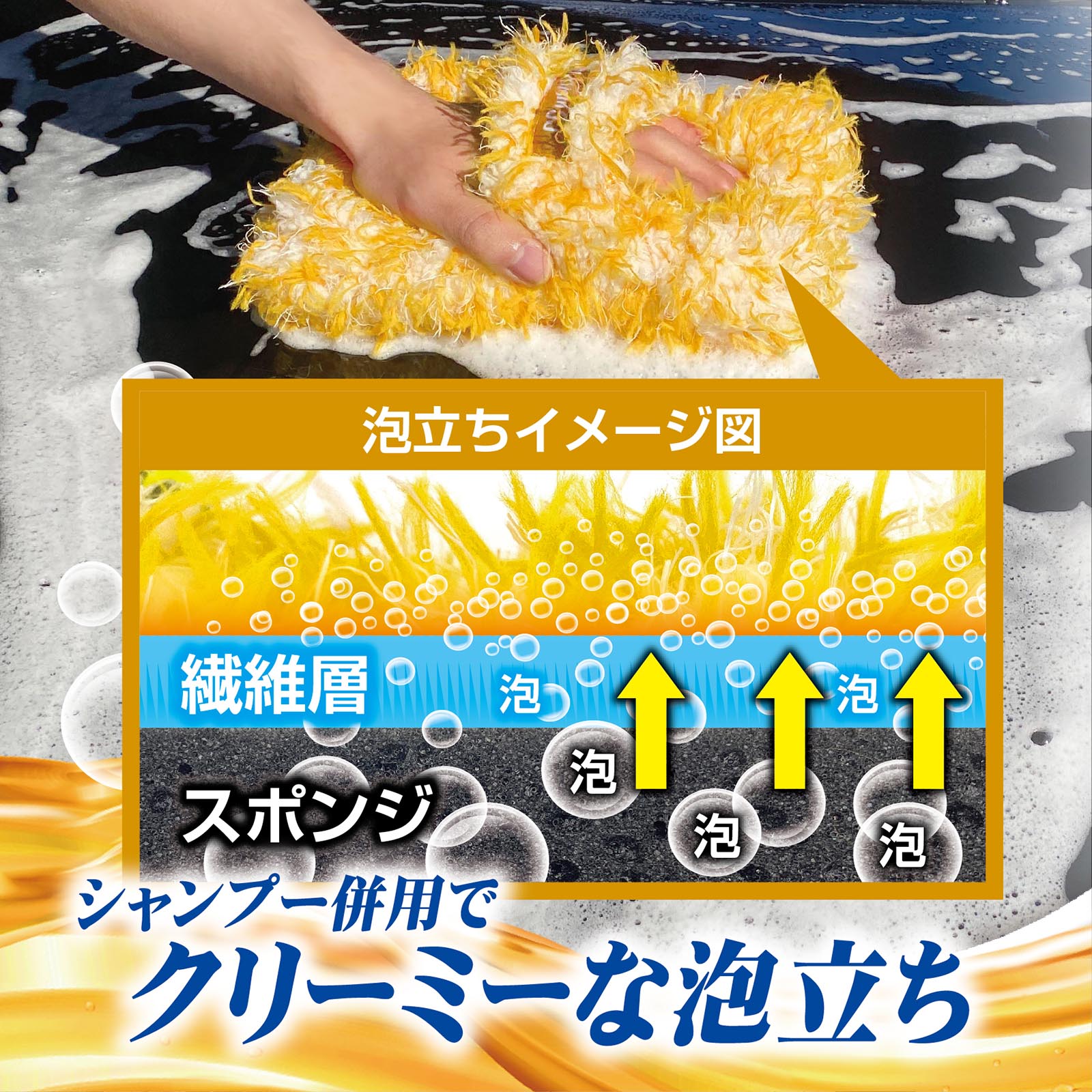 コーティング施工車にやさしく、ラクに素早く汚れを落とせる洗車用ミットです。 毛足が長く風合いの異なる繊維を組み合わせることで汚れをサッと絡め取り、軽やかでなめらかな洗い心地を実現。さらにシャンプー水をたっぷり保持できるので水切れしにくく、一回の保水で広い面をスピーディーに洗車できます。 また手をバンドにはめることで、ボディー側面の洗車時も本品を落下する事なくスイスイ洗えます。手のひらサイズで扱いやすく、全体が繊維で覆われているため、隙間洗いも気にせず洗車できます。