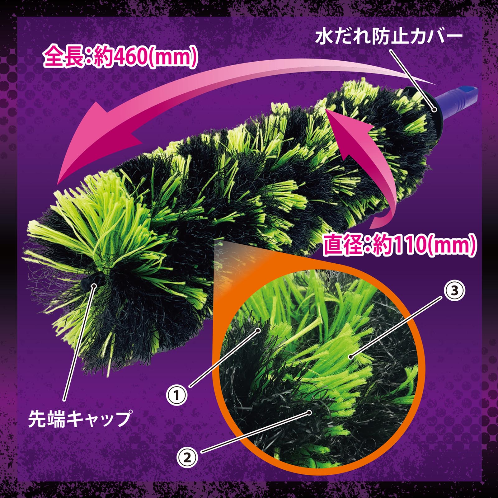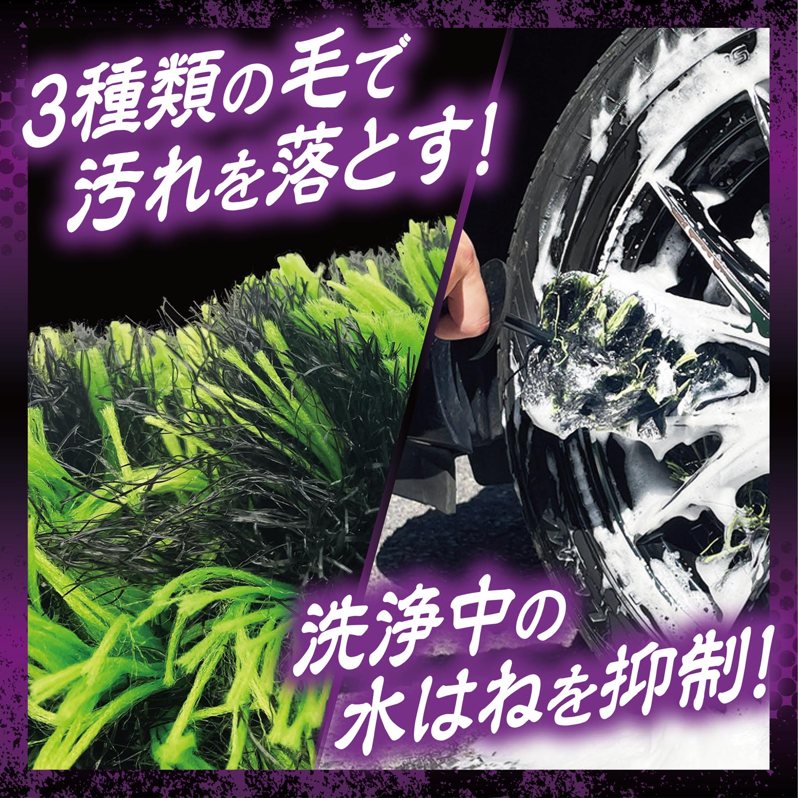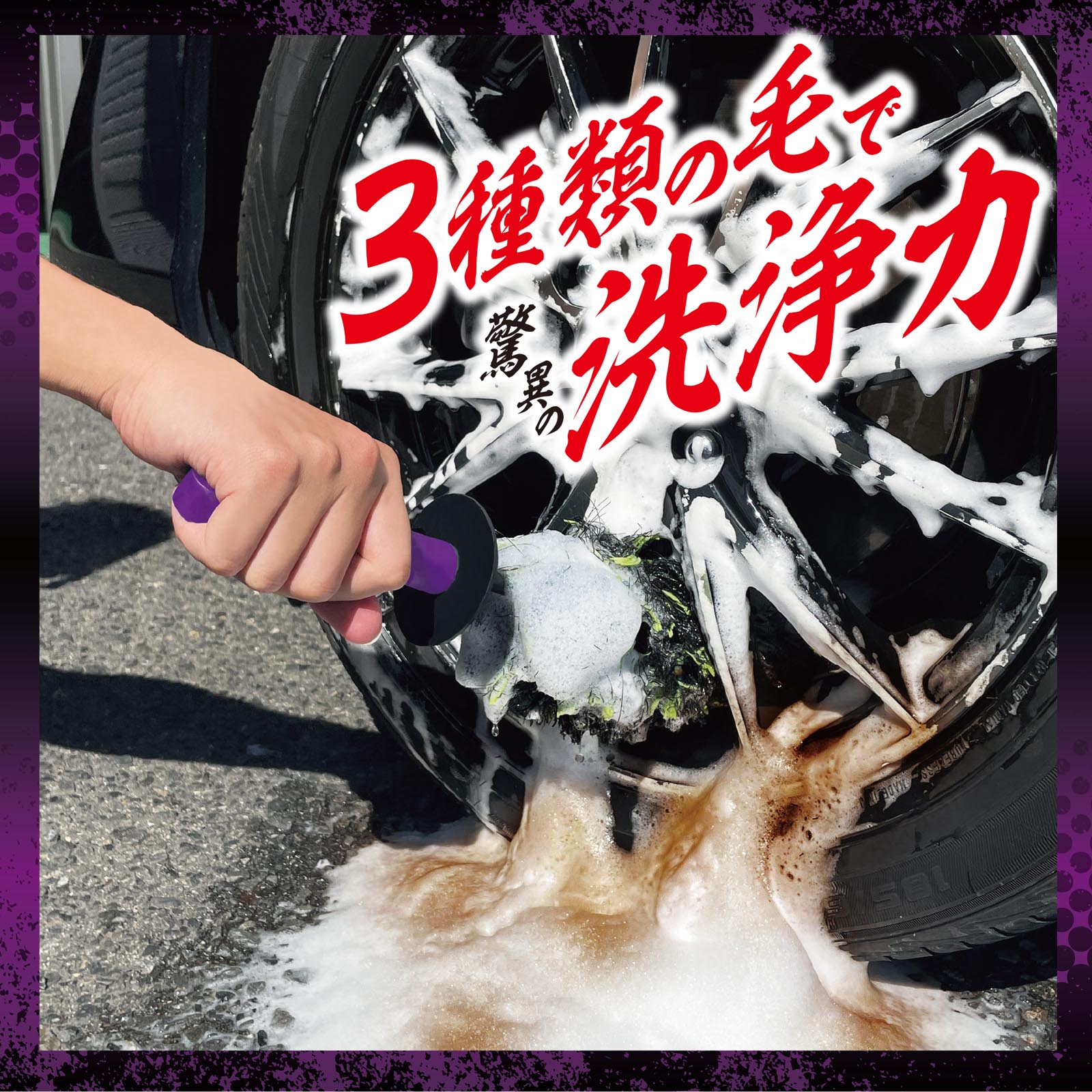 ホイール奥の汚れを落とす自動車用ホイールブラシです。3種類の毛を混合させることによりホイールの内側に付着した細かい砂や泥汚れ等を掻き取り、しっかり落とします。さらに毛量が多く隙間に入り込み、柔らかい材質によって洗浄中の水はねを抑制します。ガンコな汚れにはクリーナーと併用することで効果的に汚れを落とすことが出来ます。汚れが目立つSUVや輸入車はもちろん、幅広いホイールに使用できます。