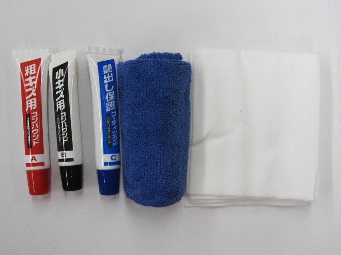 小キズ・スリキズ・水アカを消して艶ピカに仕上げる3本のチューブと、専用クロスがセットになった“キズ消し満足キット”です。 「粗キズ用コンパウンド」「小キズ用コンパウンド」「艶出し保護用コーティングWAX」と、キズの状態に応じて使い分けができる本格的な3本セット。誰でも簡単にプロ技仕上げができます。また、水アカや雨ジミ等の汚れもスッキリ落とせて、ボディー細部をしっかりお手入れできます。 ■粗キズ用:ドアノブの擦りキズ・ひっかきキズ等の磨き用(約15μm) ■小キズ用:洗車キズ等の小キズ、粗キズを処理した後の磨き用(約3μm) ■艶出し保護WAX:キズ消し後の、保護艶出し仕上げ用
