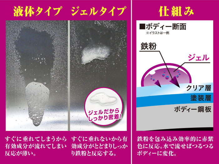密着ジェル+化学反応でガンコな鉄粉をねこそぎ落とす!