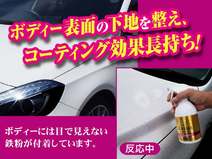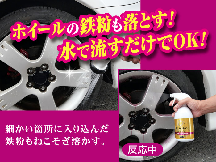 ボディーやホイールに付着した鉄粉やブレーキダストを化学反応で落とす、鉄粉除去クリーナーがグラシアスゴールドシリーズから新登場! 垂れにくく定着性の高い「ジェルタイプ」で、有効成分がしっかりと密着。ボディーやホイールに付着したガンコな鉄粉をしっかりと包み込み、素早く(赤紫色に)化学反応させ、ねこそぎ溶かし落とします。また、鉄粉取りクリーナー特有の臭いがジェルで飛散しにくく、快適な作業性を実現しました。 ボディーコーティング前の下地処理に特にオススメで、塗装表面がつるつるになりコーティング効果を最大限に発揮させます。 車全体をリフレッシュできる鉄粉取りのNEWアイテムです。