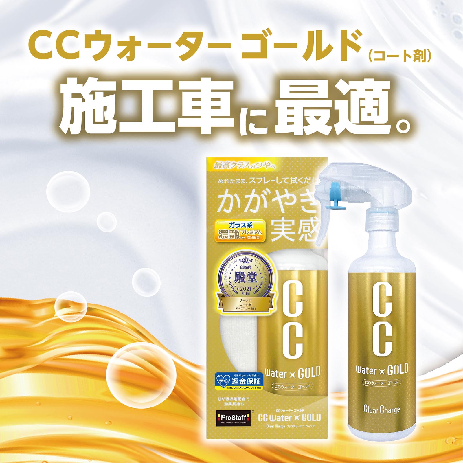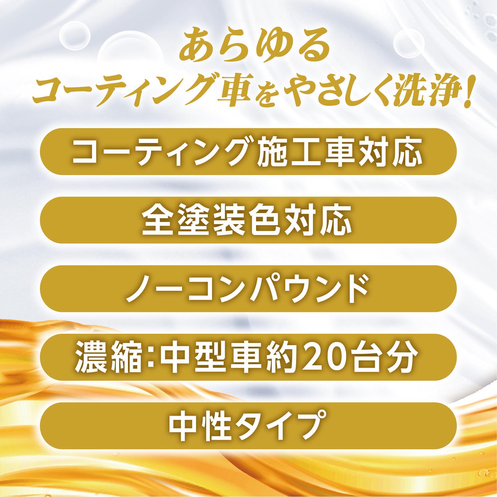 コーティングを落とさずにスッキリ洗える、希釈タイプの洗浄用シャンプーです。 きめ細かくクリーミーでなめらかな泡立ち。泡が汚れを包み込むので洗車時のキズを防ぎ、コーティング被膜の汚れをやさしく洗浄します。また泡切れもよく、キレート剤配合により洗車時のシミを防ぎスッキリ仕上がります。手やボディーにもやさしい、安心のノーコンパウンド・中性タイプ。 CCウォーターゴールド(コート剤)施工車はもちろん、その他のコーティング施工車にも最適なシャンプーです。