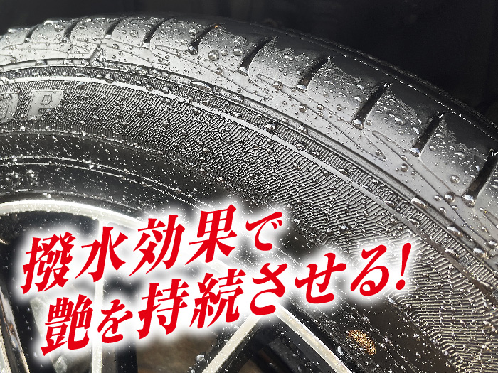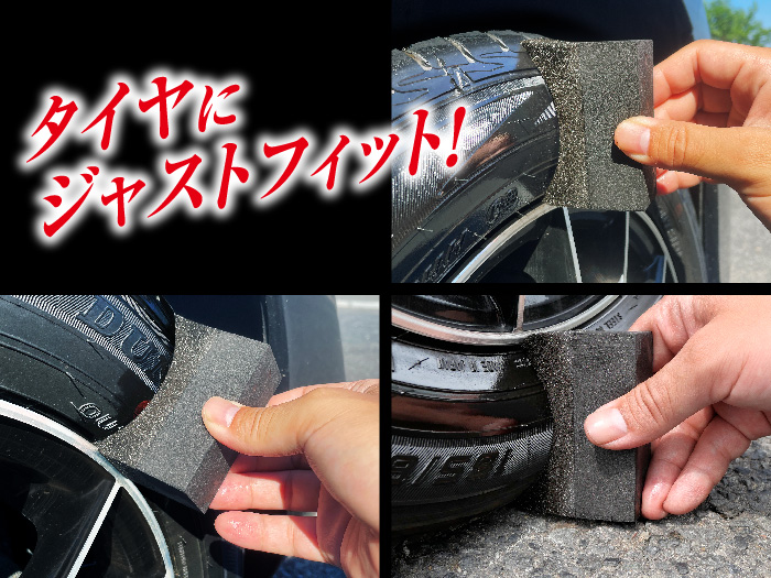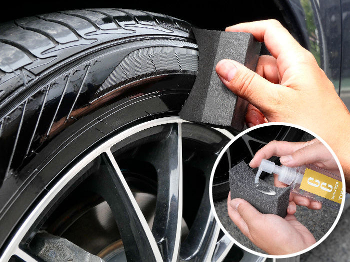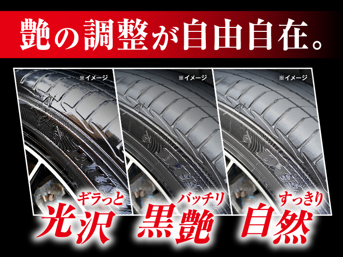 タイヤに塗るだけでコーティング効果が得られるタイヤ専用艶出しコーティング剤です。濡れたような深い艶に仕上がる高純度艶成分配合!溶剤無添加だからタイヤを傷めません。さらに、紫外線や酸化による劣化から保護します。また、撥水シリコーンが雨・汚れを弾き、上品な黒艶を持続させます。また布で拭き取ればお好みの艶に調整できます。タイヤ側面にジャストフィットする専用フィッティングスポンジが付属。2層構造のスポンジで液がグリップに染み込まないため手を汚しません。さらに内溶液の伸びが良い為、細かい隙間や溝もムラなくしっかり塗ることができます。