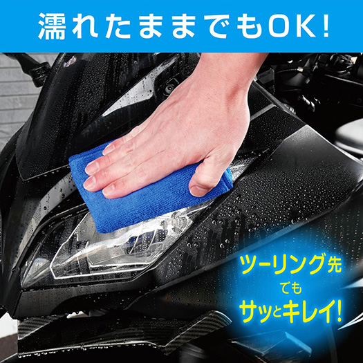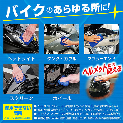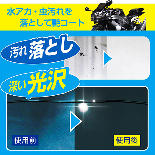 汚れ落とし&コーティングが簡単に施工できる、バイク用や携帯用にジャストサイズのガラス系コーティング剤です。 使い方はとっても簡単、スプレーしてクロスで拭くだけ!バイクのタンク・カウル・マフラー・ヘッドライト・ホイールなどの各箇所を艶々に仕上げます。 しかも、施工面が濡れていても乾いていても使用可能です。(中型バイク約3台分) こびりついた落ちにくい油・虫汚れを「浸透分解溶剤」で落とし、さらに「ガラス系ポリマー」でコーティング被膜を形成。深い艶と雨を弾いて汚れを付きにくくする撥水効果を与えます。普段のメンテナンスも手軽になり水洗いだけで汚れが落ちていきます。