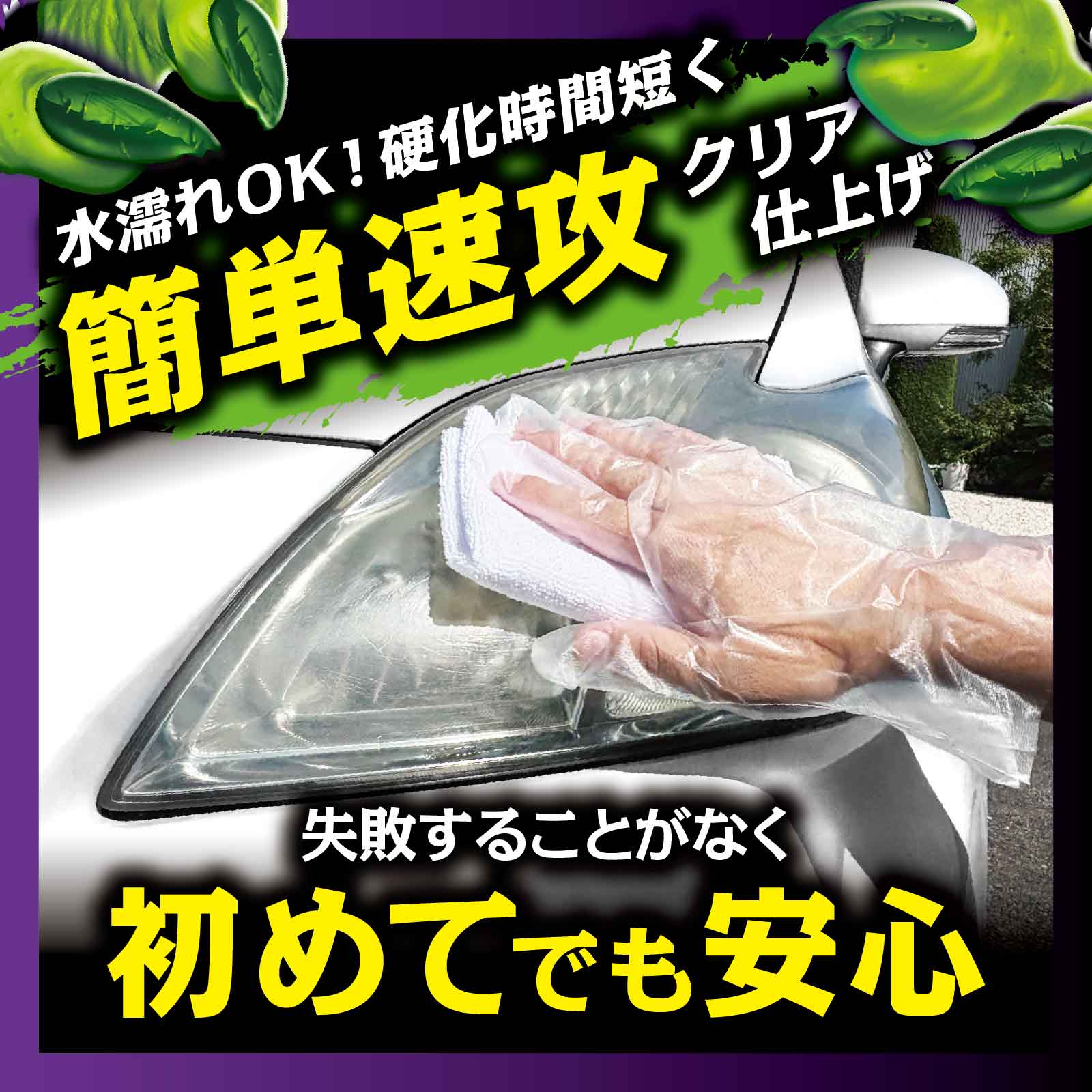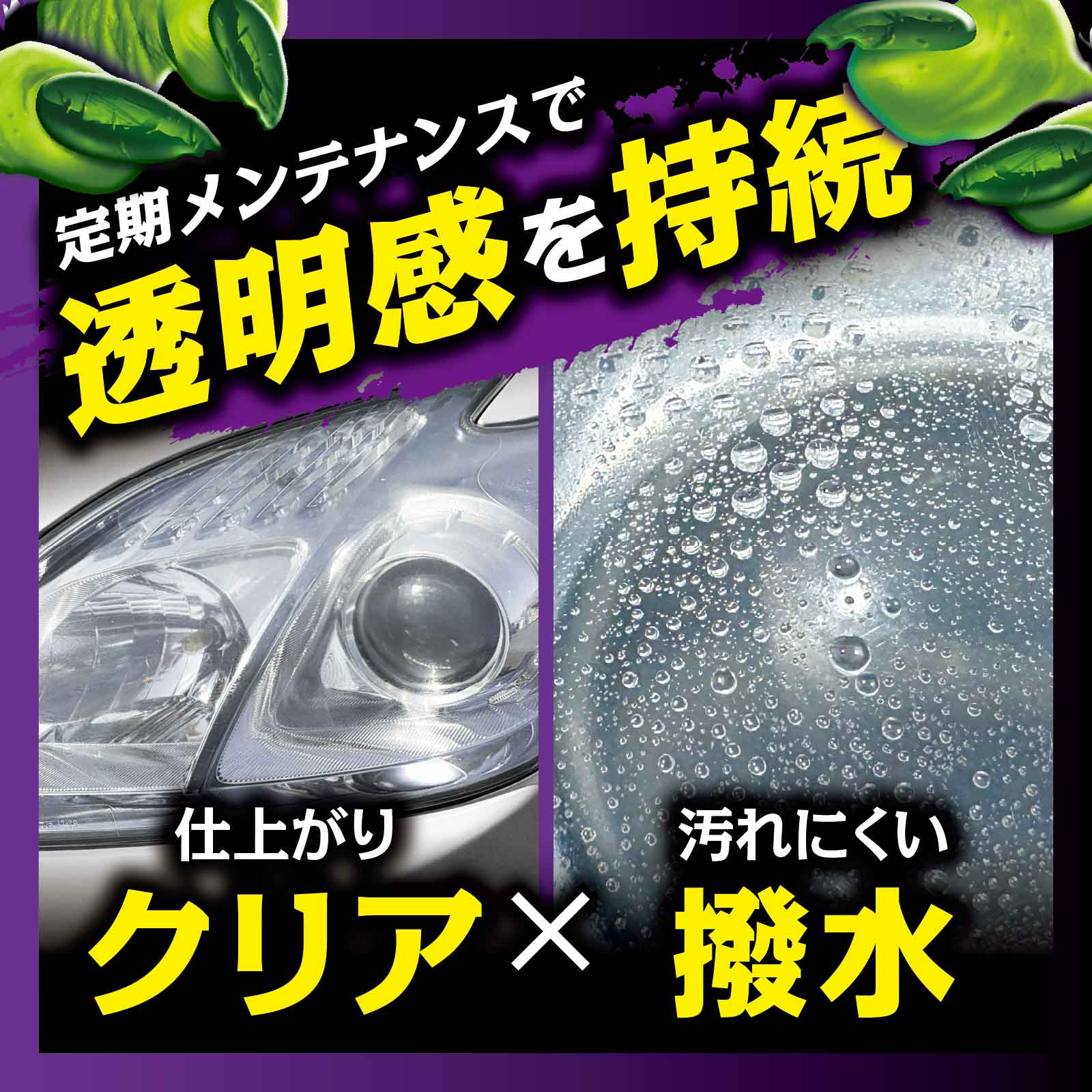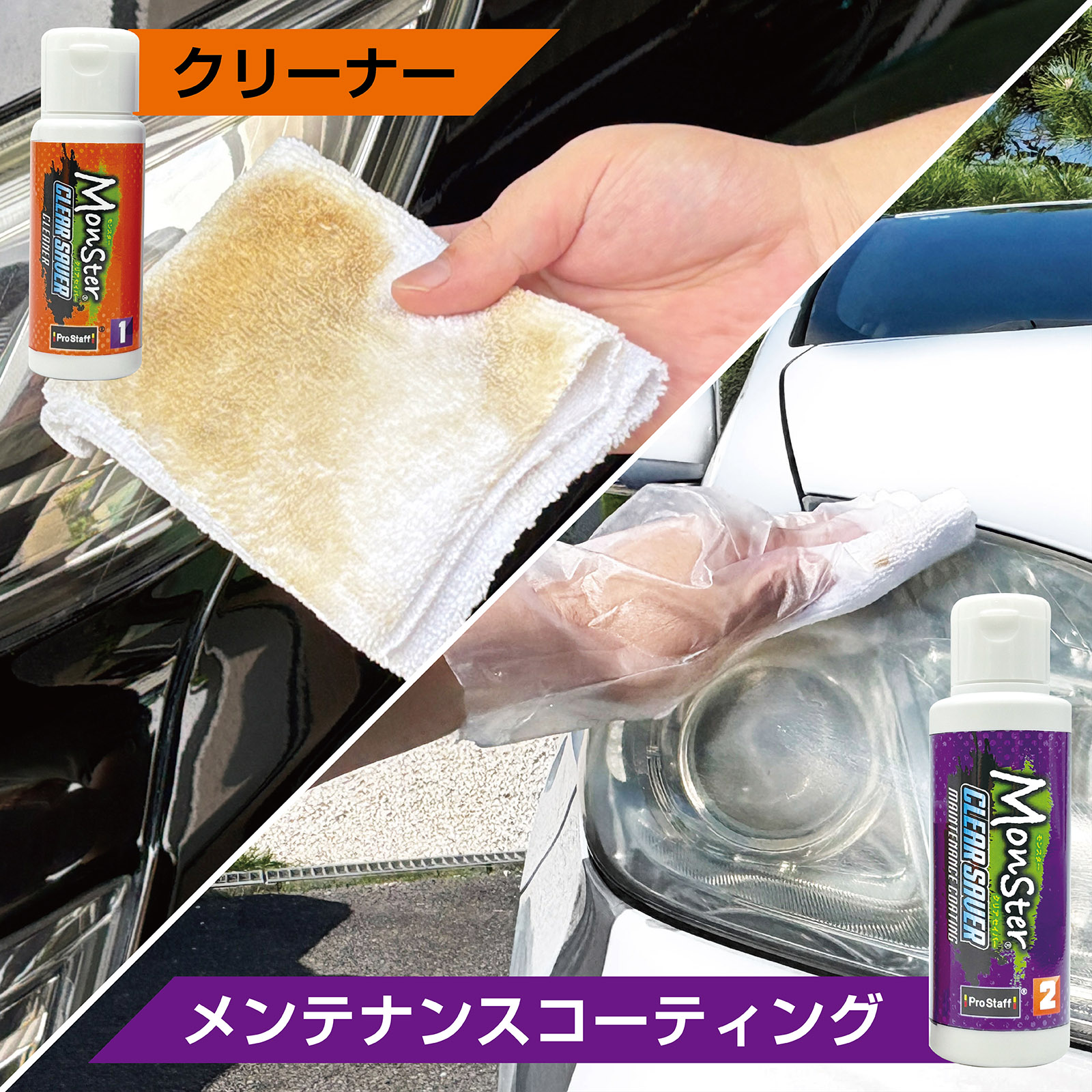 約3年間、透明感と撥水性をキープできる2液タイプのヘッドライト用コーティング+クリーナーセットです。 クリーナーは「溶かす × 磨く」のW効果で黄ばみ・くすみを強力に除去し、ヘッドライト本来のクリアな輝きを復活。続いてメンテナンスコーティングを塗布することで、UV吸収剤と撥水成分がつややかな保護被膜を形成し、黄ばみ再発や汚れ付着、劣化を抑えます。水濡れOKで硬化も早いので、洗車後に誰でも簡単に施工できます。 必要なアイテムがすべて揃っており、約3ヶ月ごとに定期メンテナンスすることで12回分=約3年間、美しい状態を維持できます。