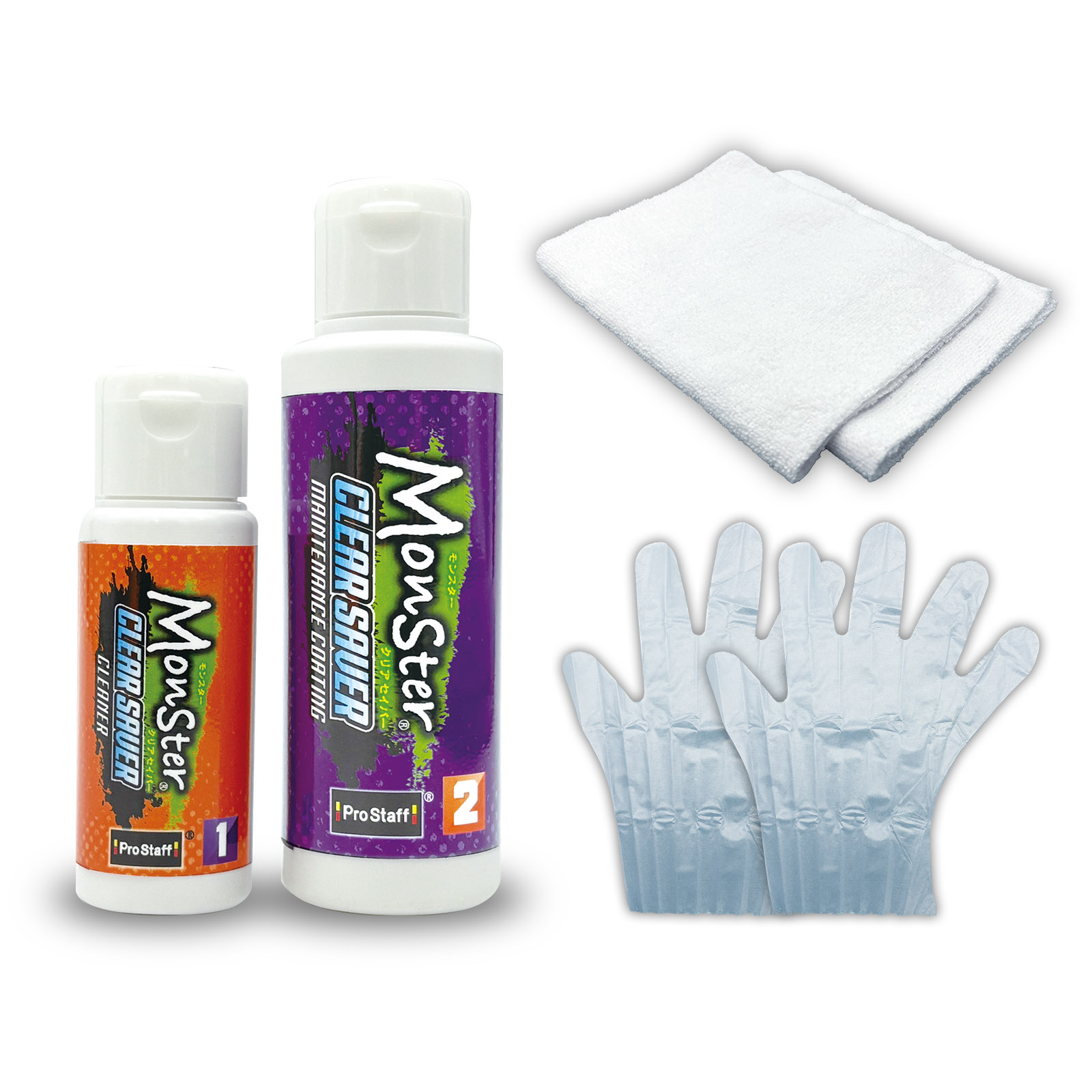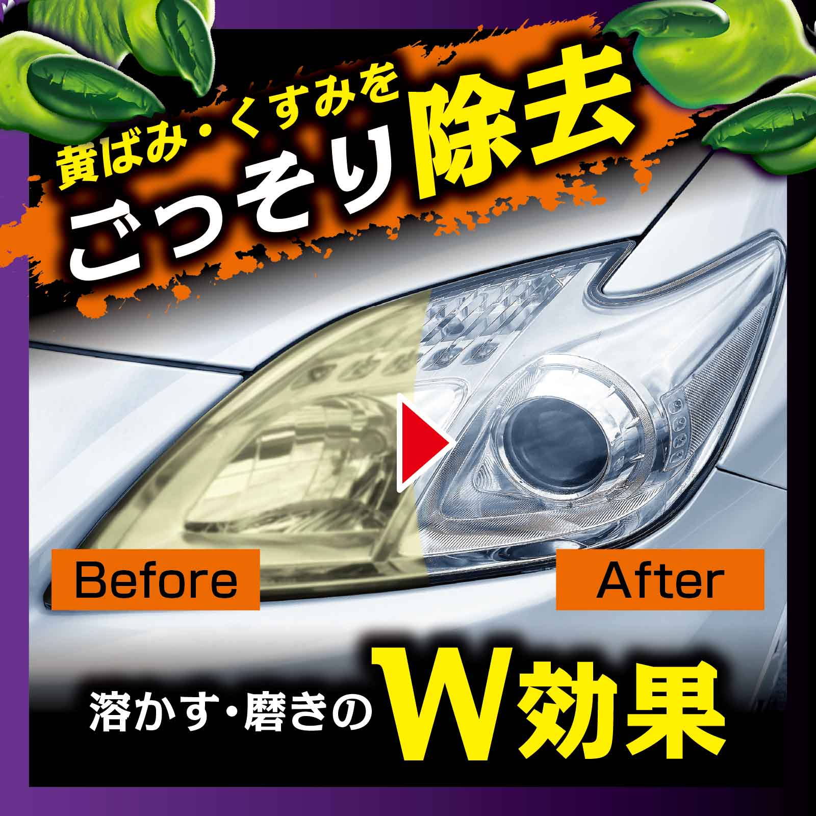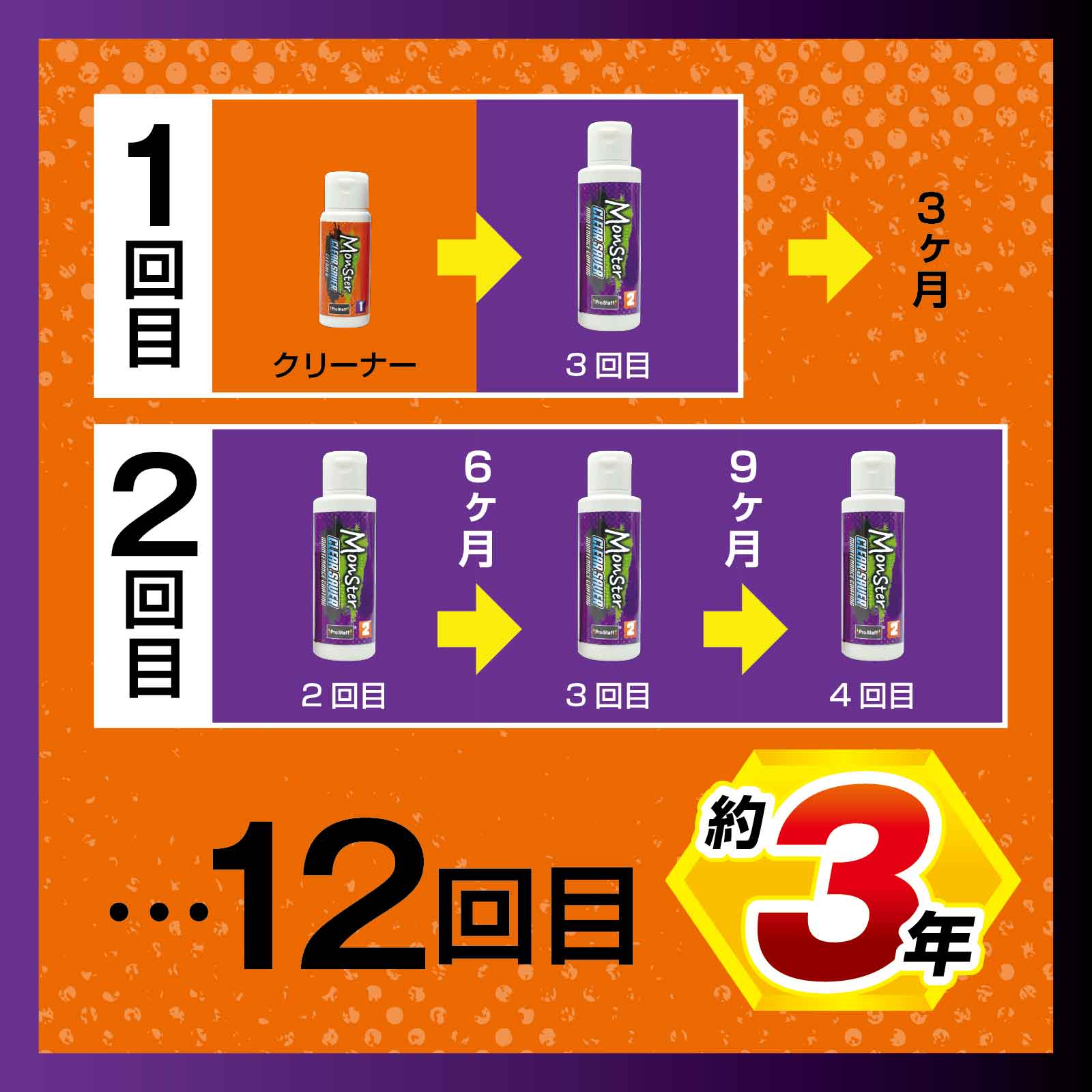 約3年間、透明感と撥水性をキープできる2液タイプのヘッドライト用コーティング+クリーナーセットです。 クリーナーは「溶かす × 磨く」のW効果で黄ばみ・くすみを強力に除去し、ヘッドライト本来のクリアな輝きを復活。続いてメンテナンスコーティングを塗布することで、UV吸収剤と撥水成分がつややかな保護被膜を形成し、黄ばみ再発や汚れ付着、劣化を抑えます。水濡れOKで硬化も早いので、洗車後に誰でも簡単に施工できます。 必要なアイテムがすべて揃っており、約3ヶ月ごとに定期メンテナンスすることで12回分=約3年間、美しい状態を維持できます。