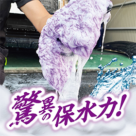 700×400㎜の大判サイズとボリュームたっぷりの超極細繊維により、約1.4リットルと優れた吸水力を発揮します。繊維をツイスト状にすることで拭き上げ時の抵抗を減少させました。軽く滑らせるだけで拭き跡を残さずに、中型車1台を拭き上げられます。